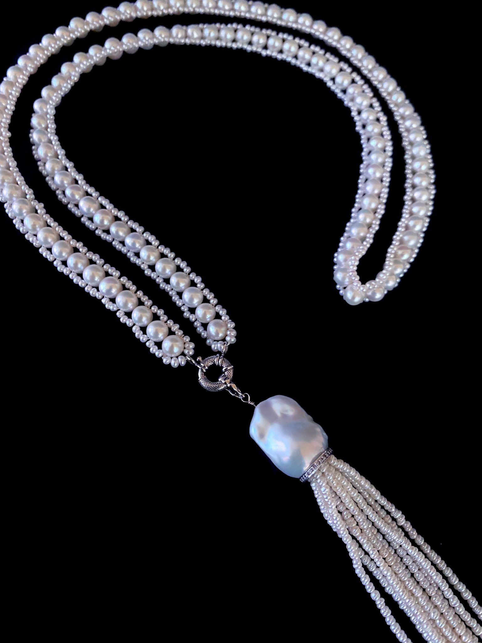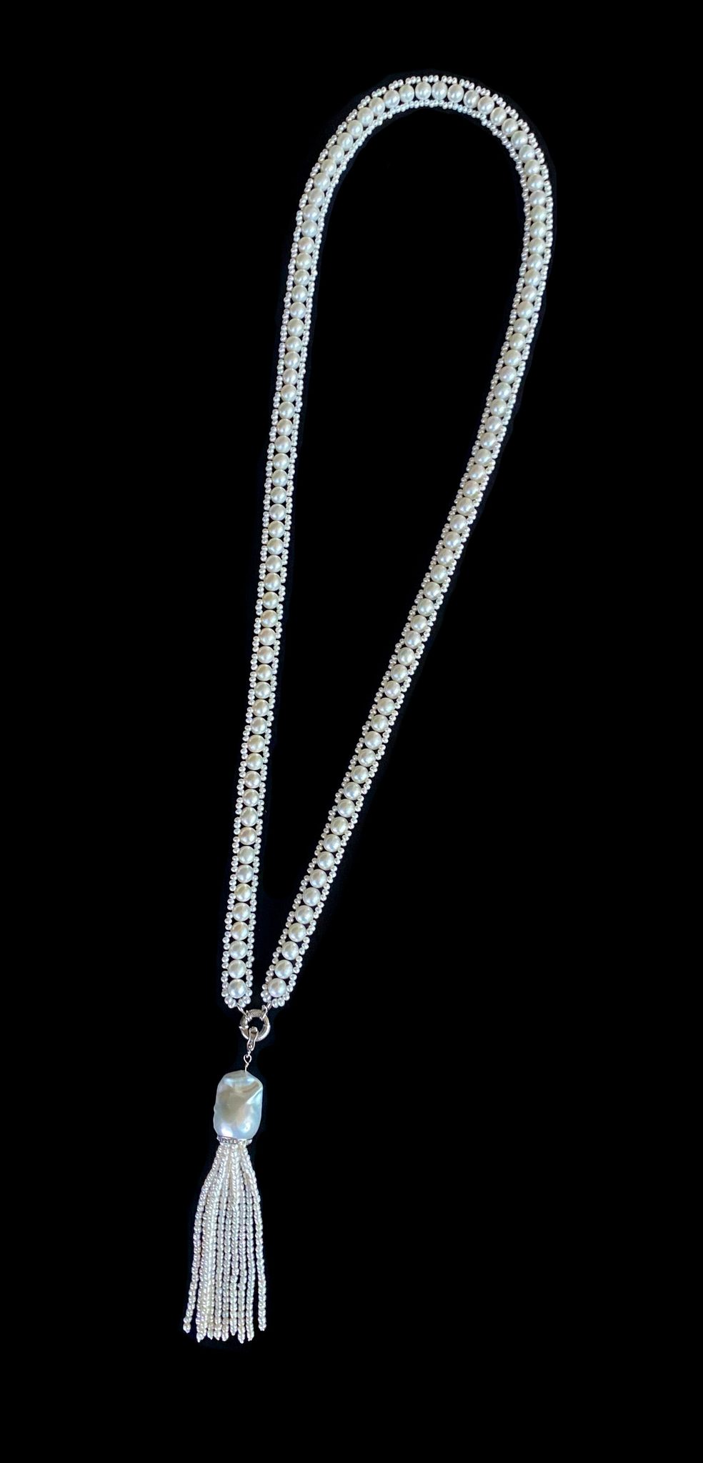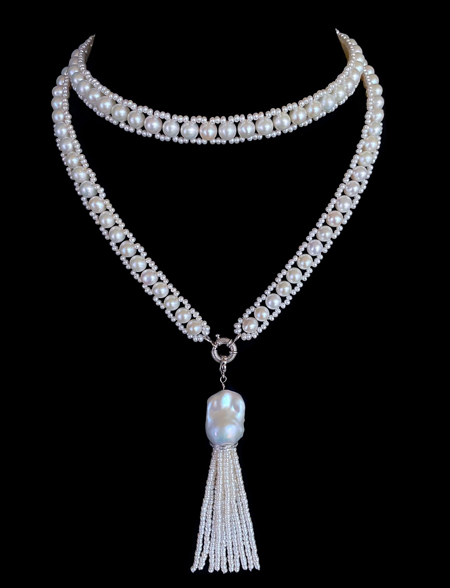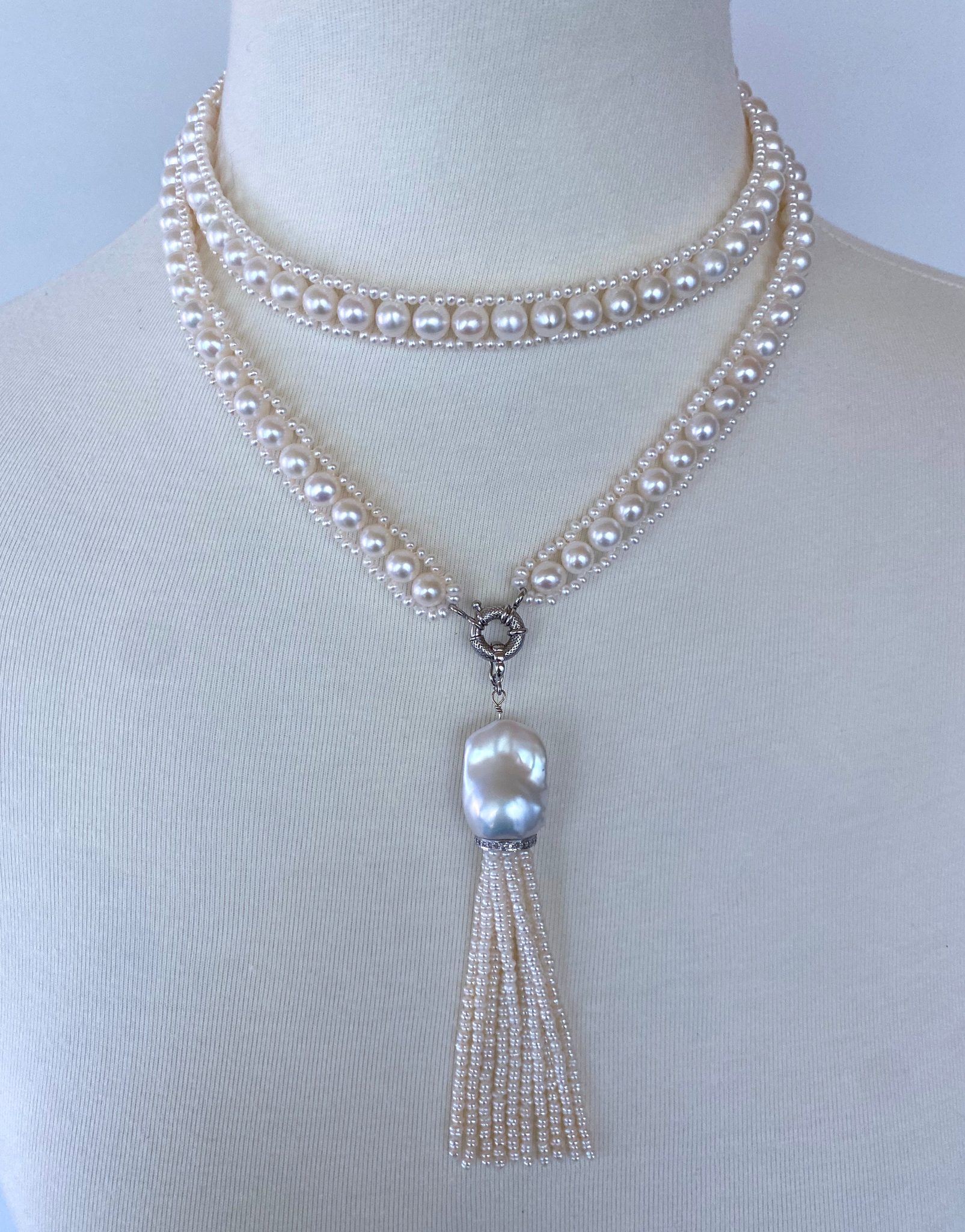 Classic piece by Marina J. This sautoir is made of multi sized Pearls woven together into a column like design. The white Pearls hold a beautiful luster to them that perfectly match the dramatic, removable Tassel. Measuring 33 inches long sans Tassel, those ends of this Sautoir meet at solid 14k White Gold hooks that latch onto a decorative solid 14k White Gold Ring Clasp – from which a 3.5 inch removable Tassel hangs. The Tassel is made of a gorgeous Baroque Pearl displaying a colorful iridescence luster, sitting atop a Diamond encrusted roundel from which strands of Seed Pearls hang. A perfect piece for any formal or bridal event.