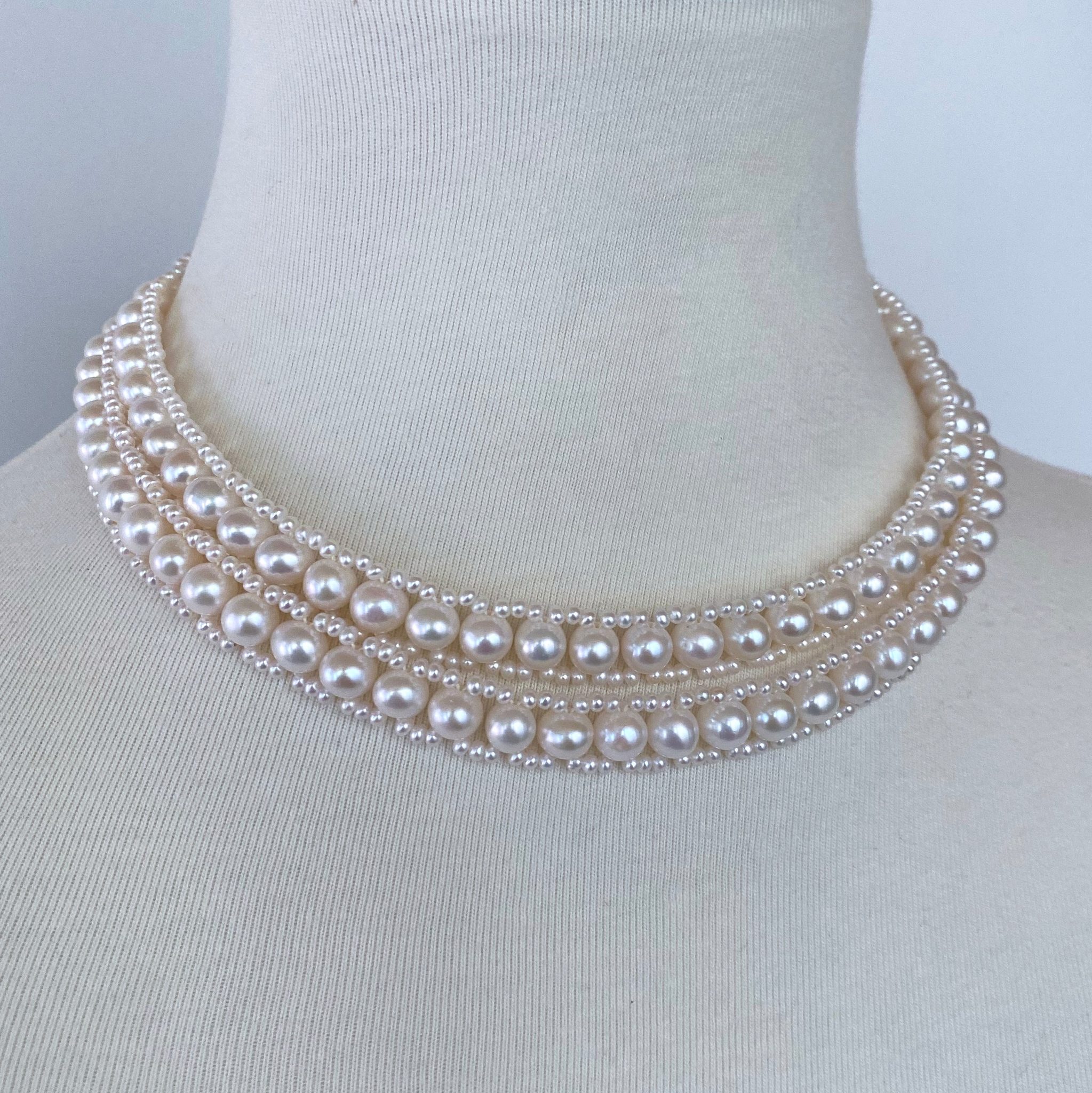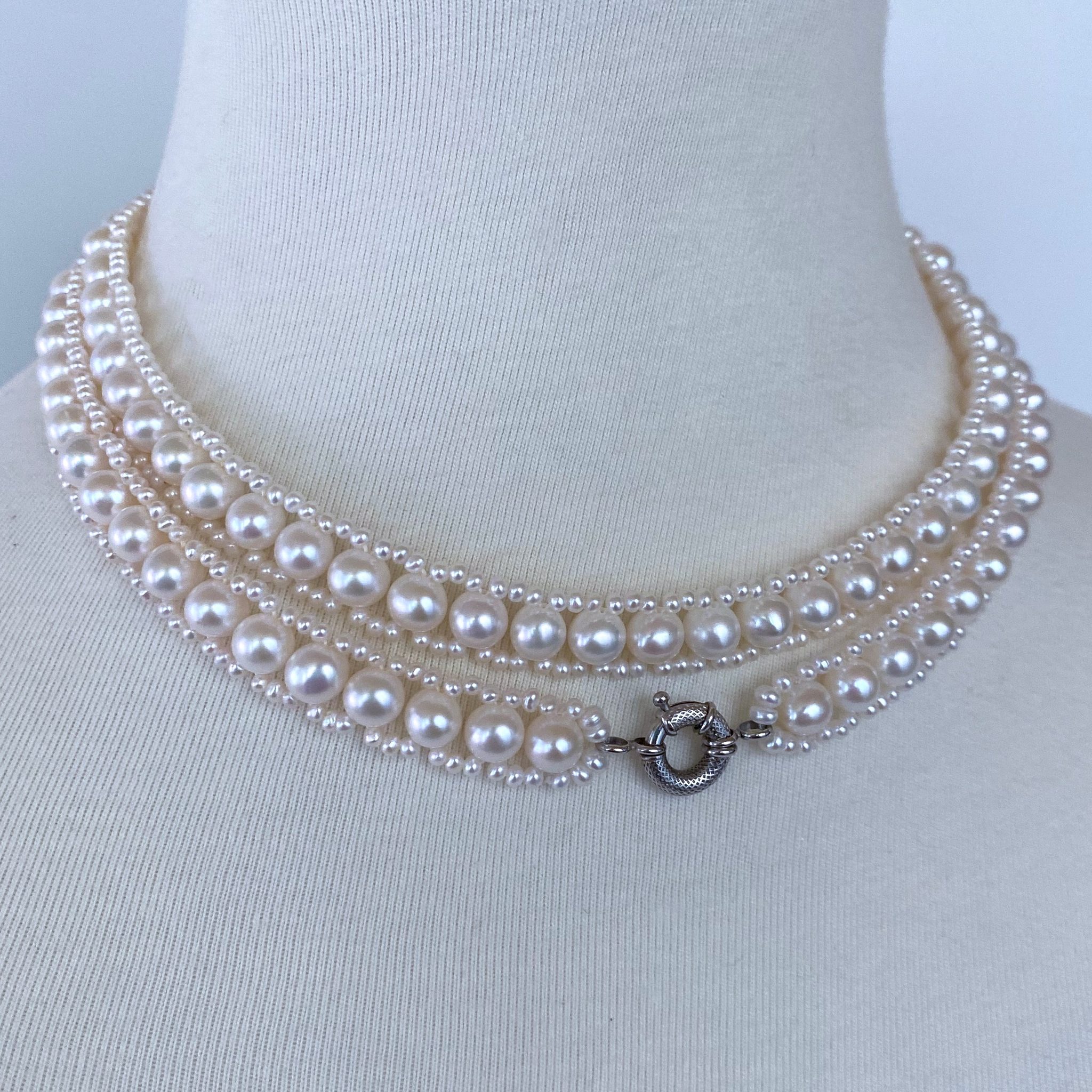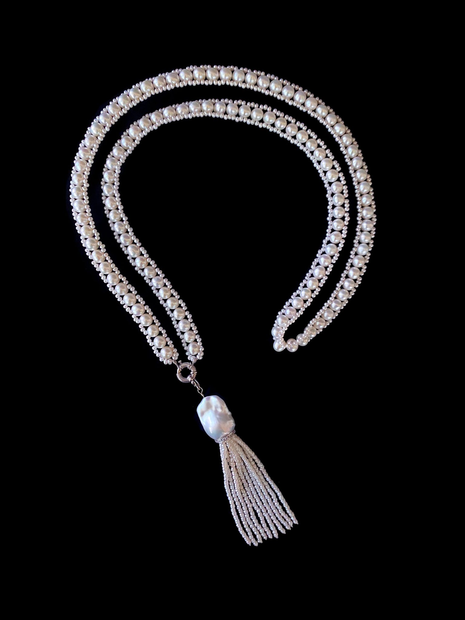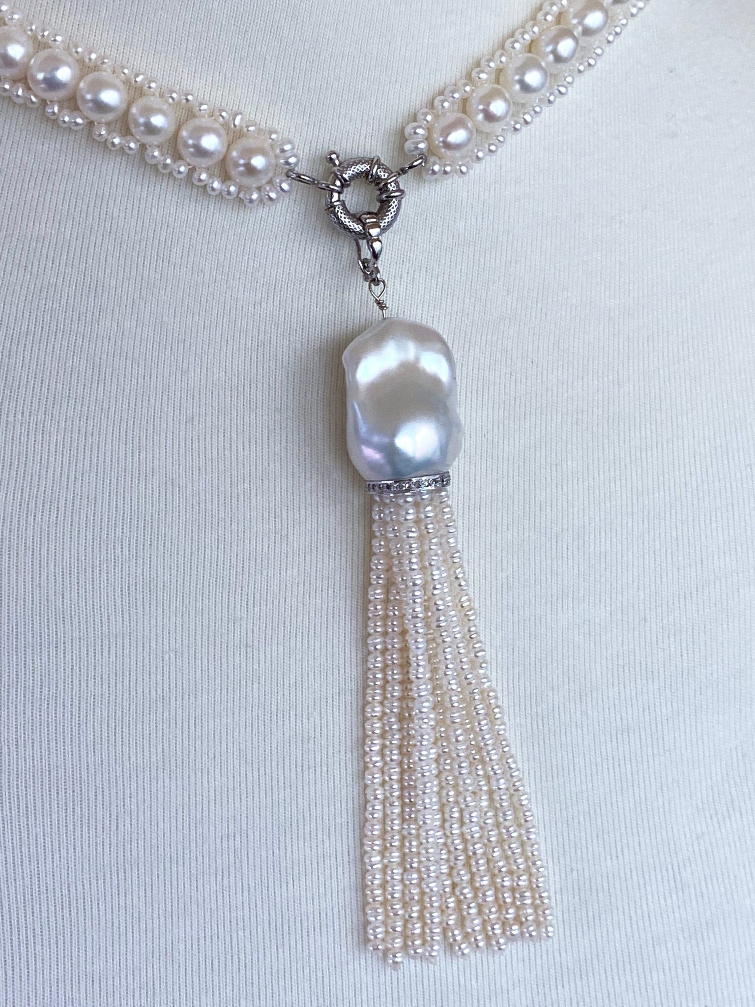 Classic piece by Marina J. This sautoir is made of multi sized Pearls woven together into a column like design. The white Pearls hold a beautiful luster to them that perfectly match the dramatic, removable Tassel. Measuring 33 inches long sans Tassel, those ends of this Sautoir meet at solid 14k White Gold hooks that latch onto a decorative solid 14k White Gold Ring Clasp – from which a 3.5 inch removable Tassel hangs. The Tassel is made of a gorgeous Baroque Pearl displaying a colorful iridescence luster, sitting atop a Diamond encrusted roundel from which strands of Seed Pearls hang. A perfect piece for any formal or bridal event.