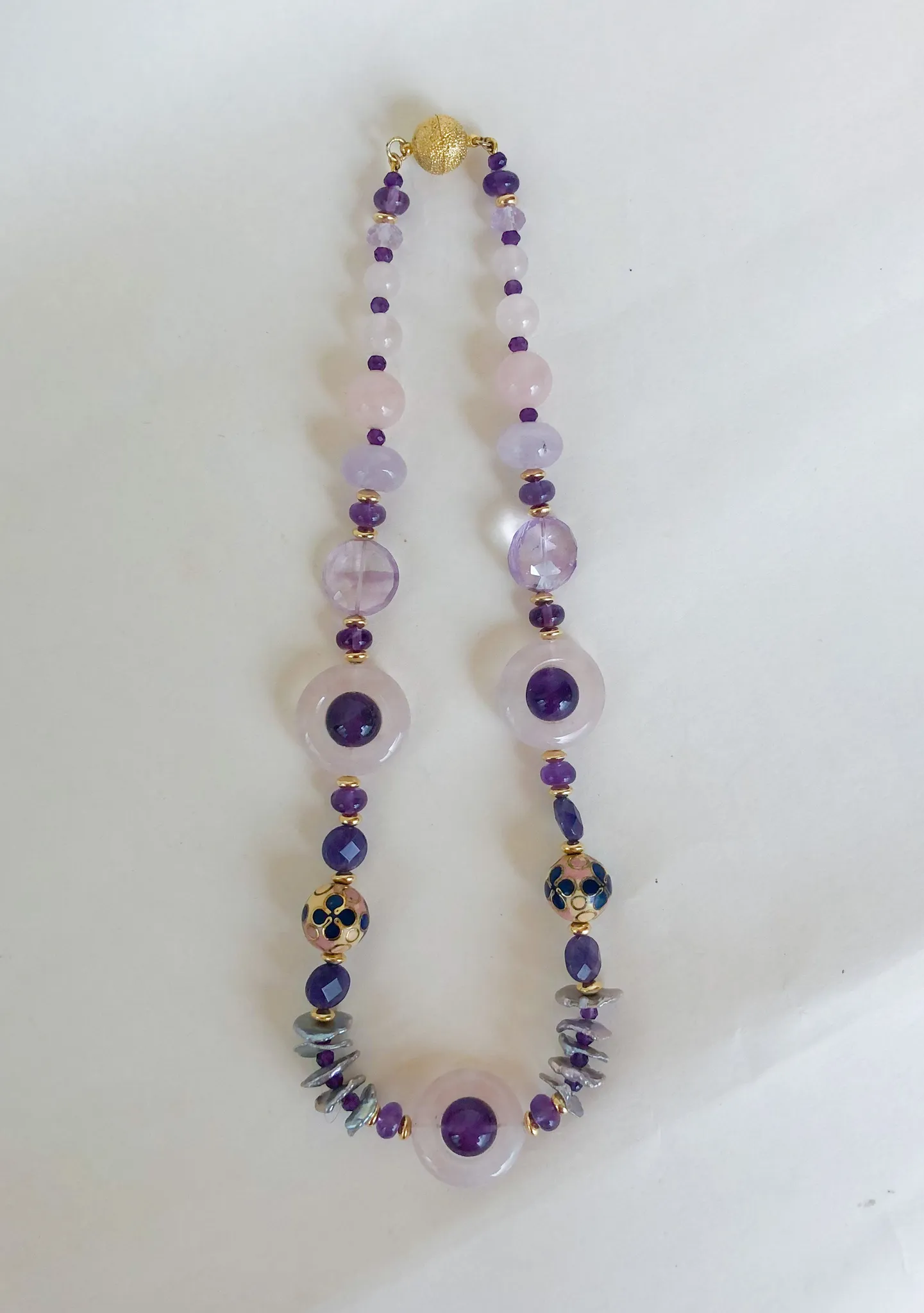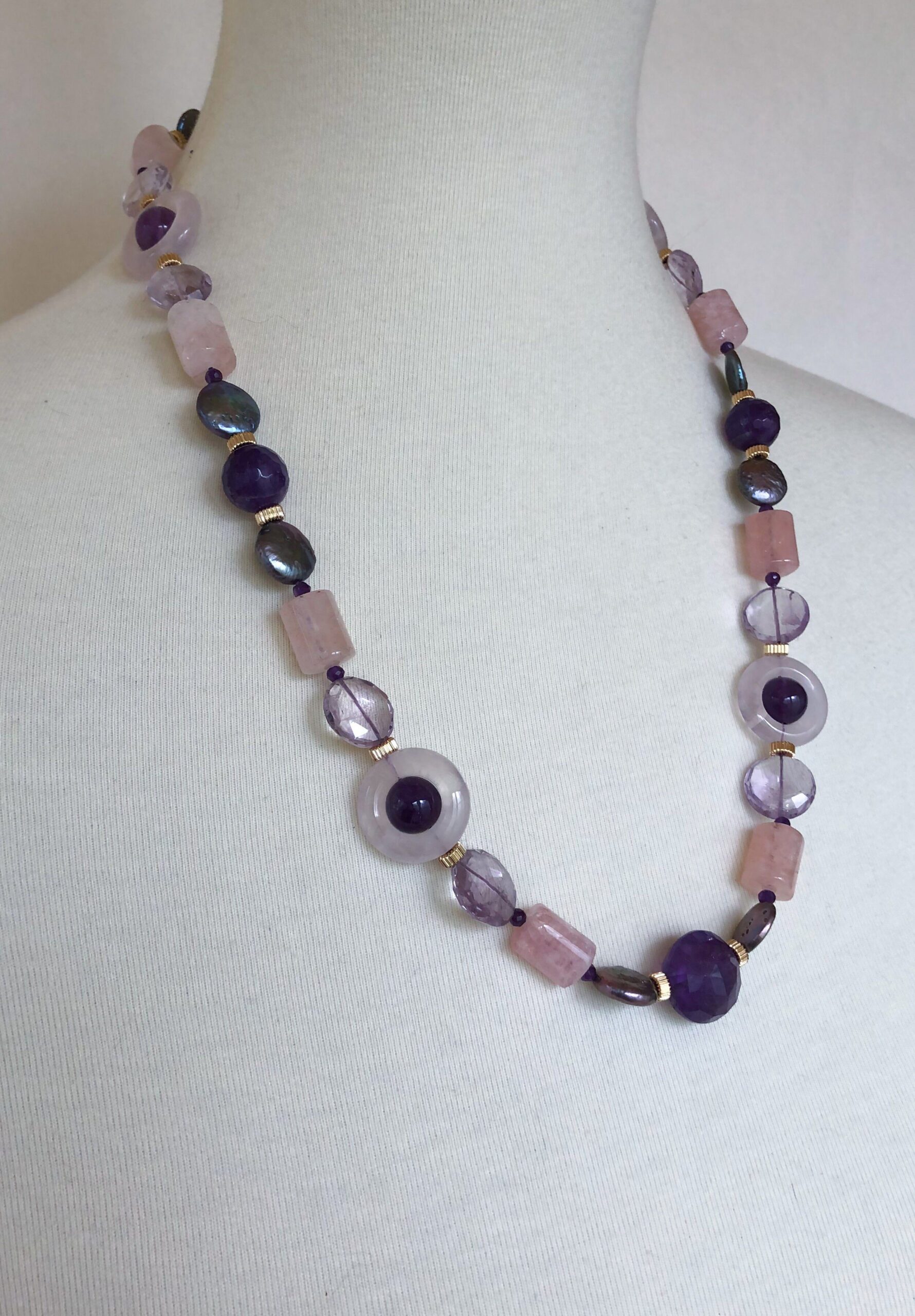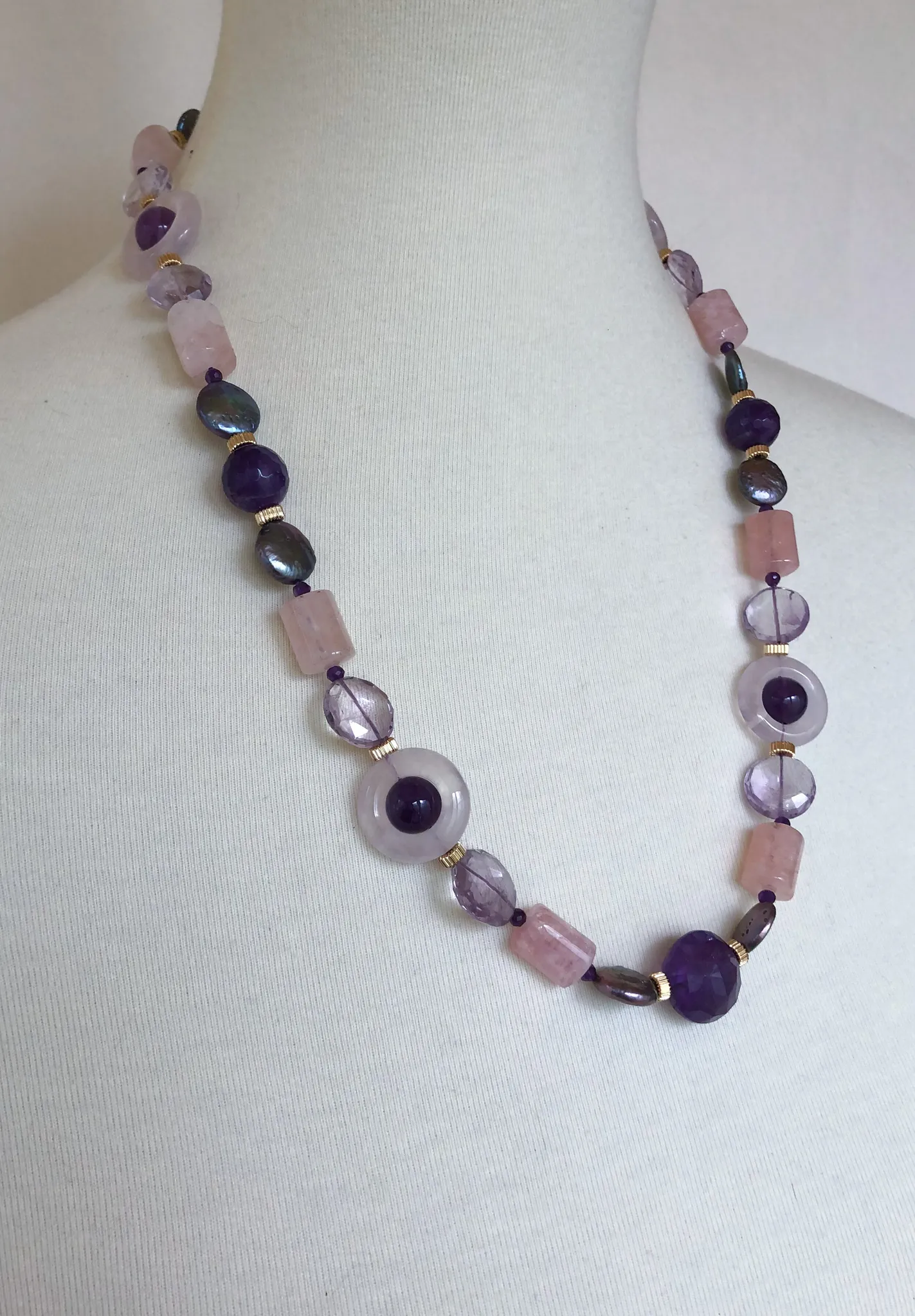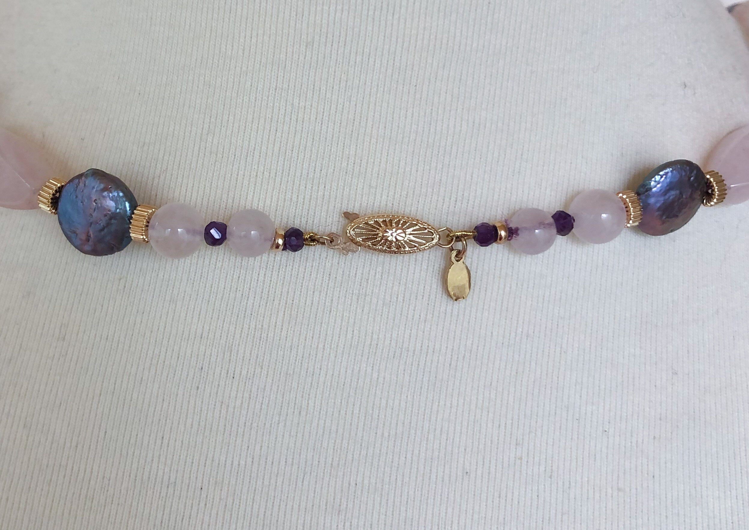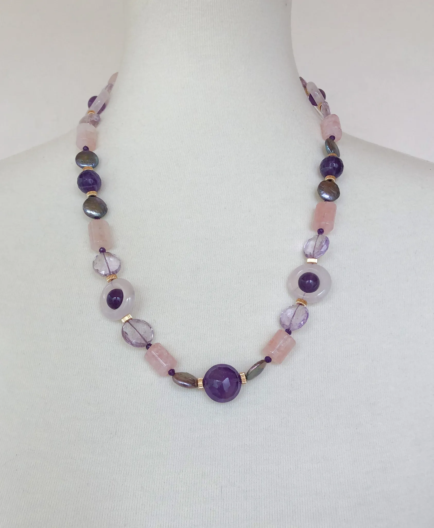 The Amethyst, Rose Quartz, Pink Aquamarine & Pearl Necklace with 14k Gold by Marina J is a refined expression of timeless elegance and heirloom craftsmanship.
