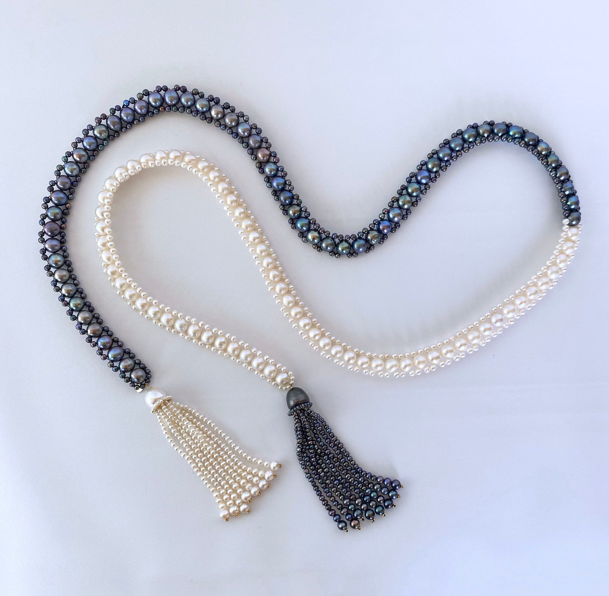 Gorgeous one of a kind Art Deco inspired two tone Sautoir Necklace hand woven by Marina J. This lovely piece is made using all Cultured Black and White Pearls (measuring 3mm and 8mm) which all display an amazing iridescent sheen and ‘oil spill’ look. Each Pearl has been individually chosen to ensure uniformity throughout this Sautoir. This piece is highly versatile and can be worn in a variety of different ways as shown in photos. Measuring 44 inches long, this Sautoir features beautiful Graduated Pearl Tassels (3.5 inch tassels made with 1mm to 5mm Pearls) with 14k Yellow Gold accents on each end; The Graduated strands hang from Baroque Pearls sitting atop a 14k Yellow Gold Roundel bordered by Seed Pearls. Perfect for any formal or bridal occasion, this piece will make a statement wherever you go!