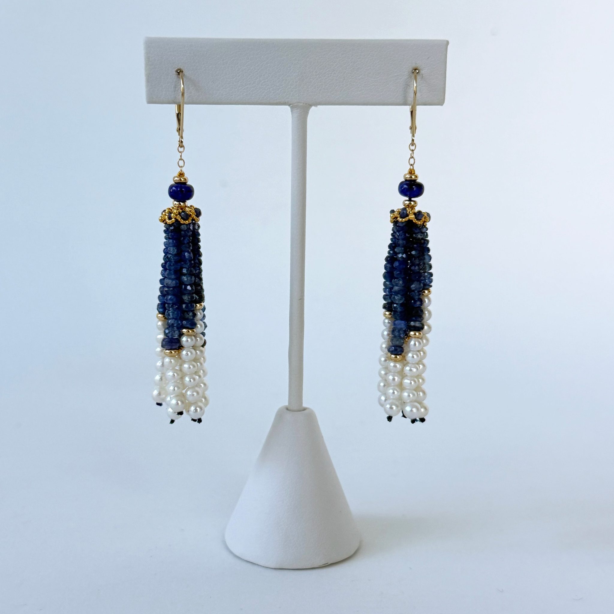 Striking pair of Earrings by Marina J.This pair features all Solid 14k Yellow Gold, Faceted Blue Sapphire and Pearls. A round Blue Sapphire bead and Solid 14k Yellow Gold findings sit atop a Solid 14k Yellow Gold Cup, encrusted with Faceted Blues Sapphires, from which strands of Graduated Faceted Blue Sapphire, Solid 14k Yellow Gold Findings and Pearls hang. Measuring 3 inches long, this pair hangs off Solid 14k Yellow Gold Chain which meets at Solid 14k Yellow Gold Lever Back Hooks. A perfect piece for any formal or bridal occasion.
