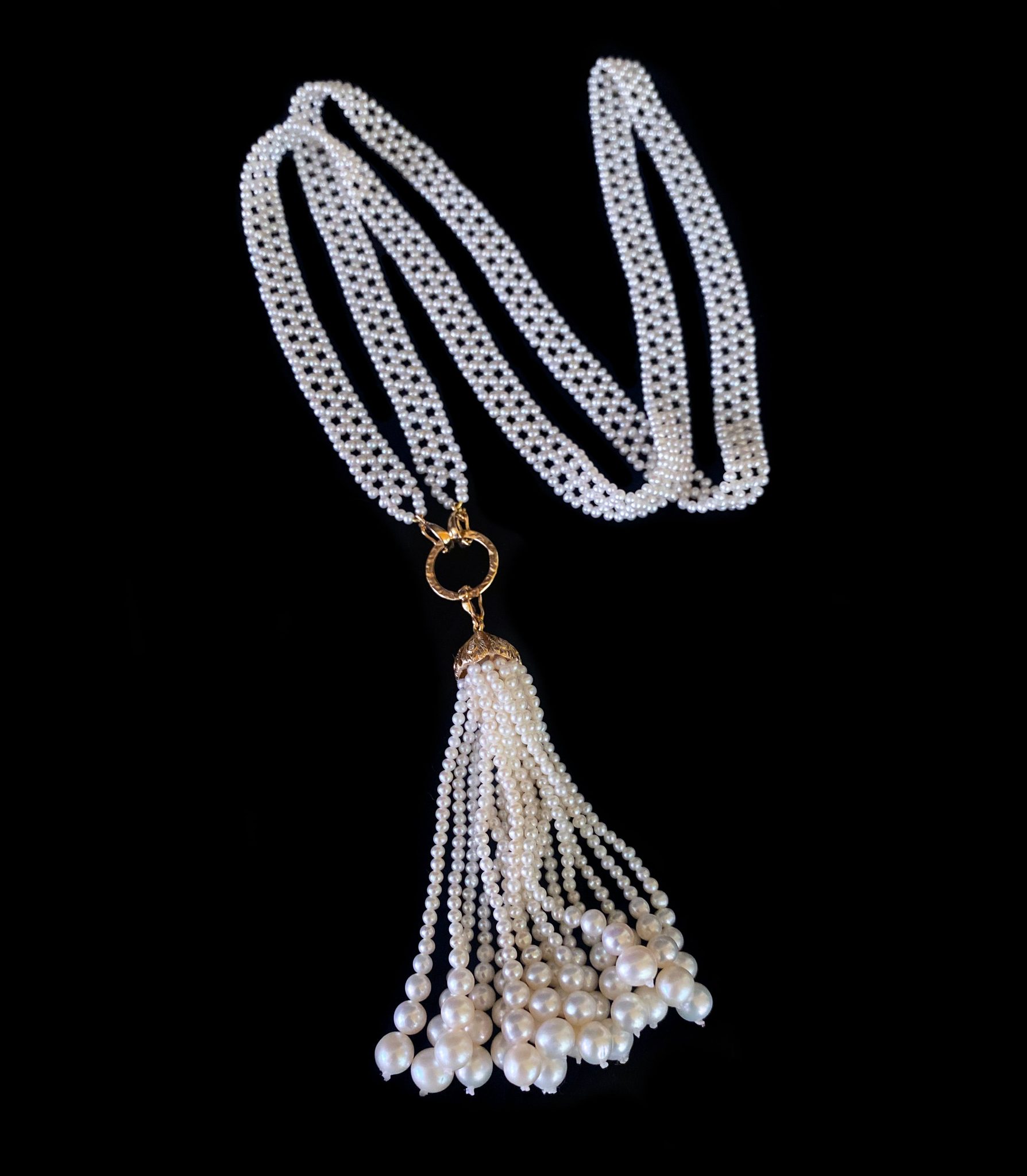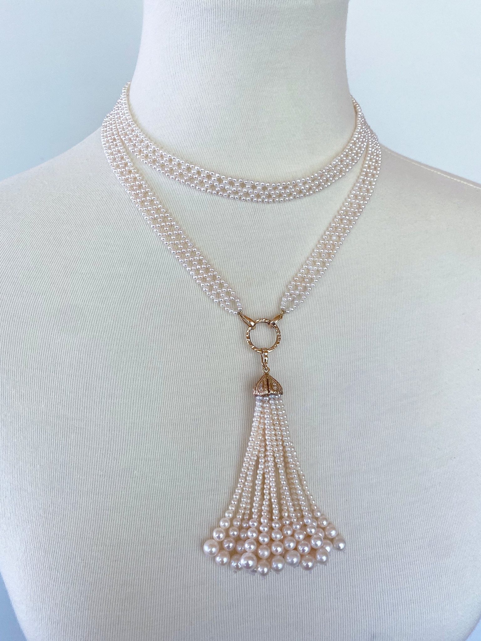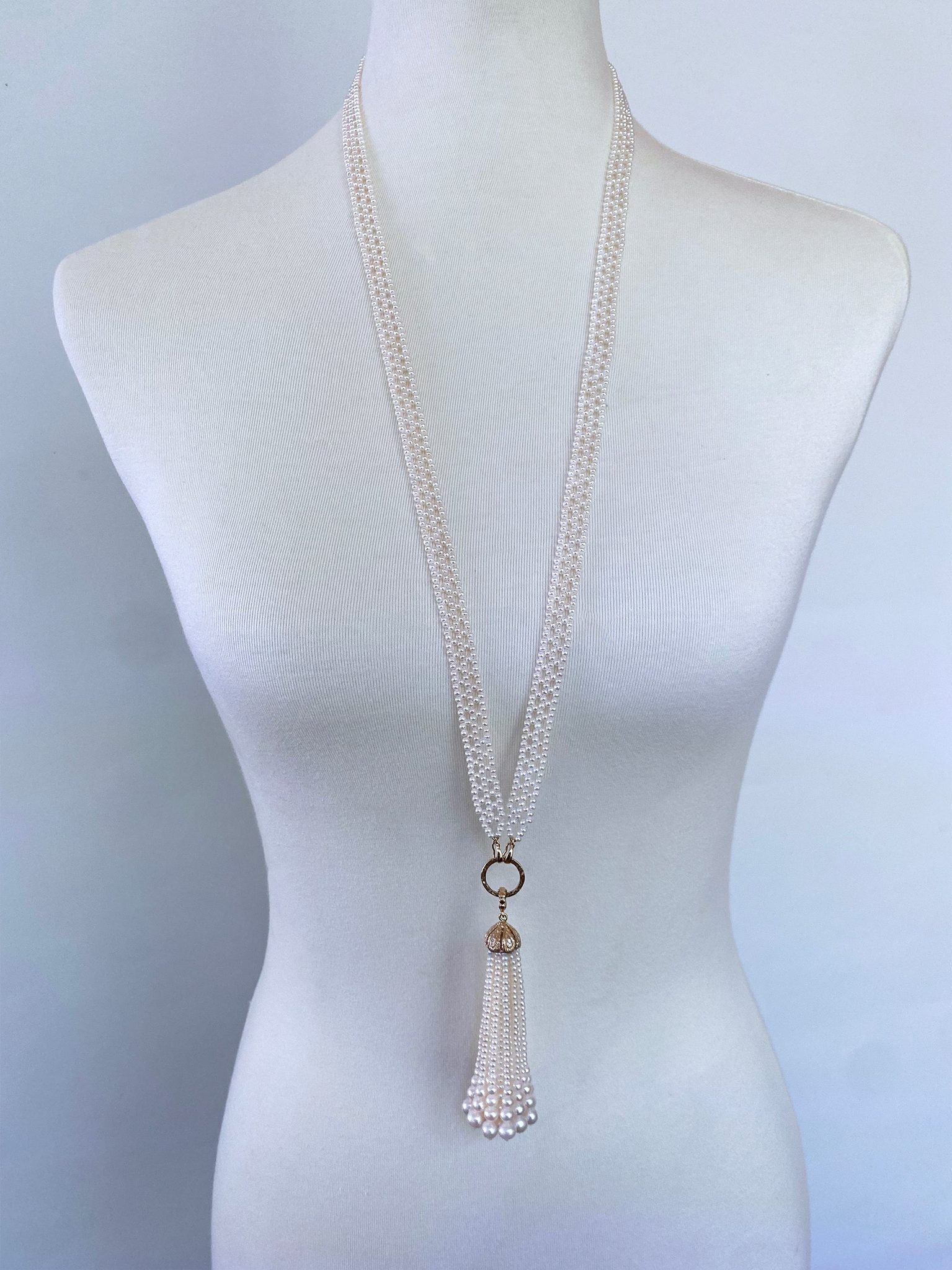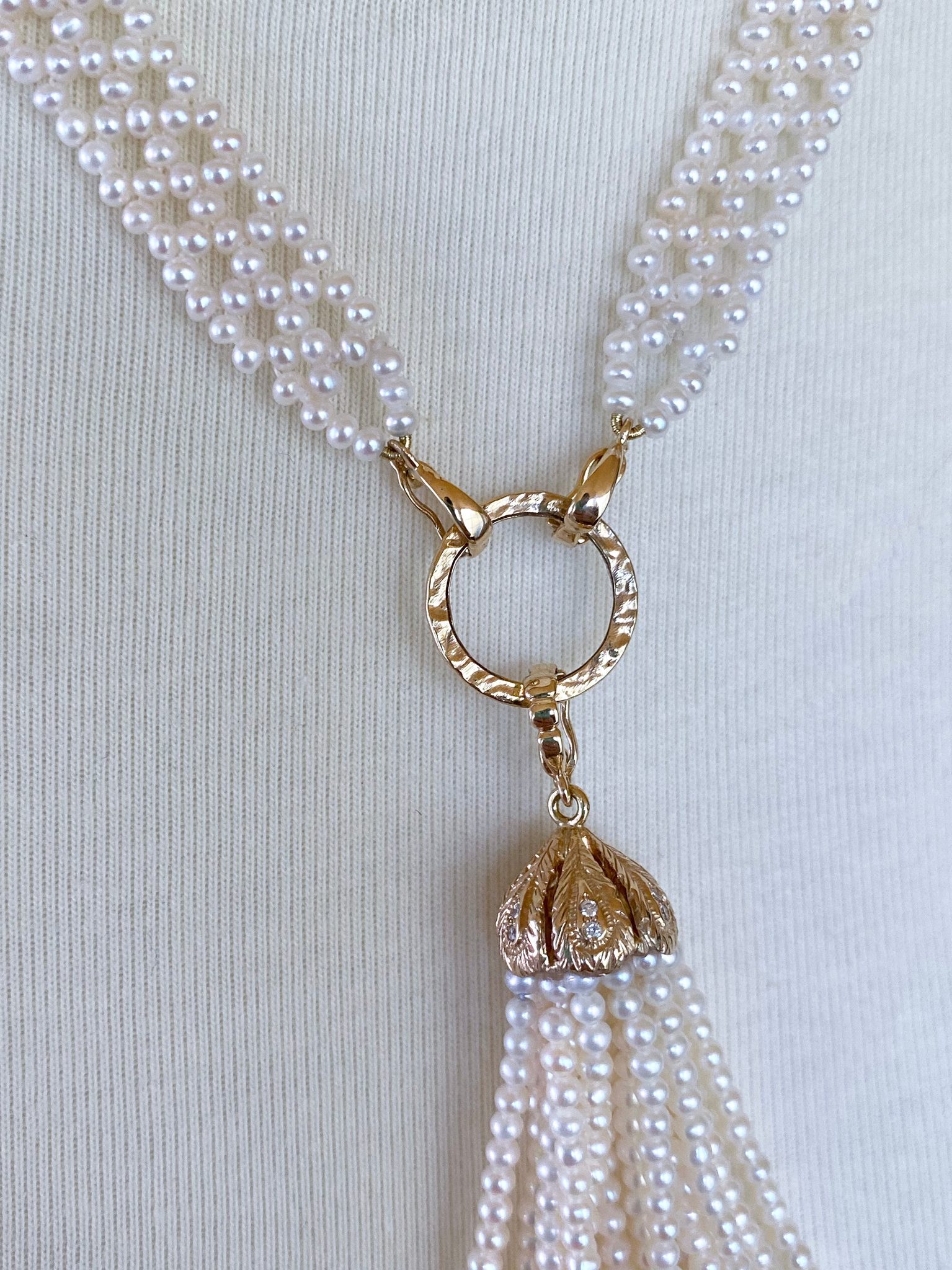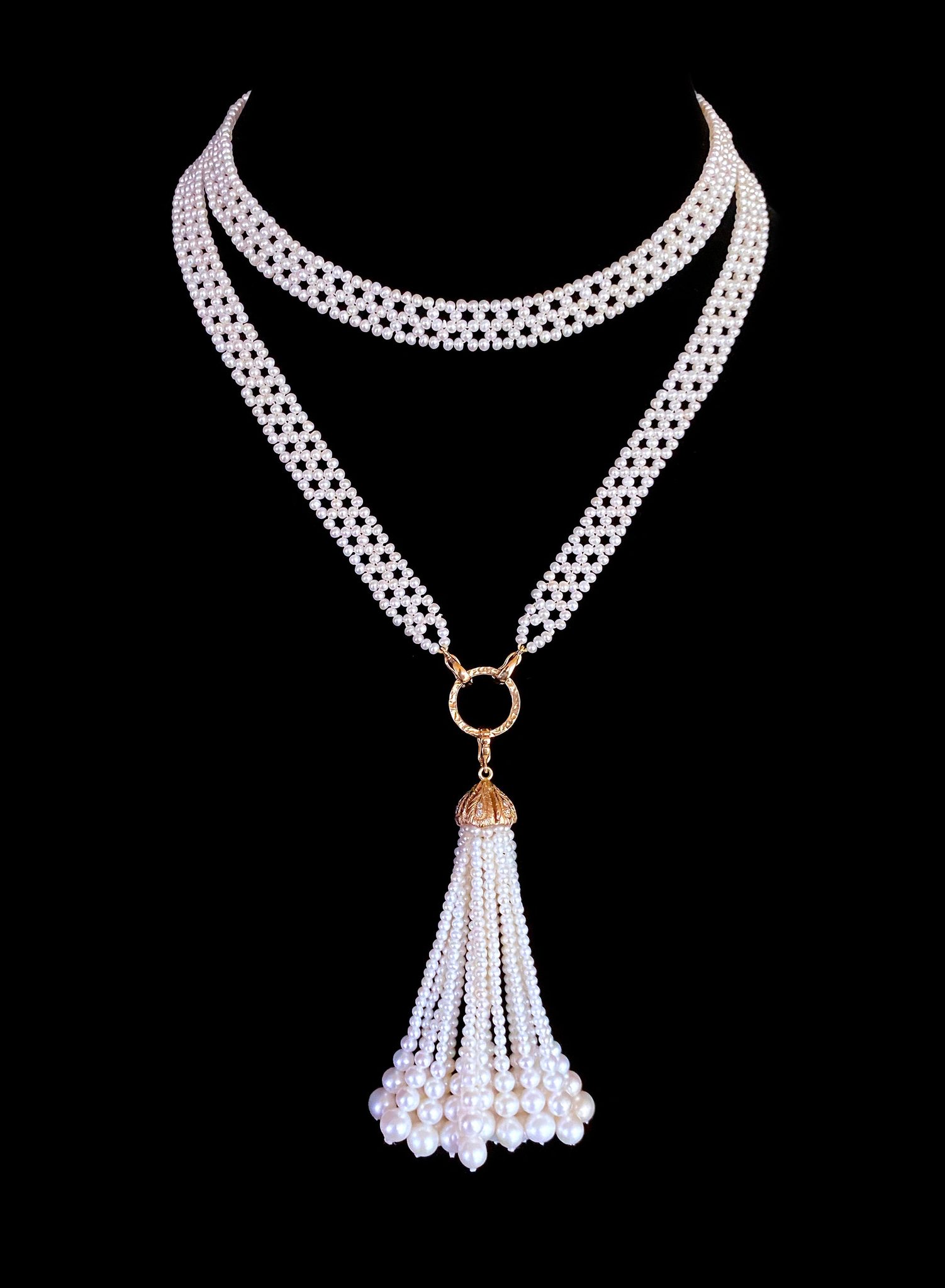 Classic piece by Marina J. This Sautoir is made of all Seed Pearls intricately woven together into a beautiful Lace design. Measuring 33 inches long sans Tassel, each end of the Lace Woven Pearl Sautoir meet at solid 14k Yellow Gold hooks which latch onto a solid 14k Yellow Gold textured Ring. A 3.5 inch Tassel hangs off the Ring with a matching solid 14k Yellow Gold hook. The Tassel is made of a decorative Filigree solid 14k Yellow Gold, Diamond encrusted cup, from which multiple strands of Graduated Pearls hang. This piece is perfect for any formal or bridal occasion.
