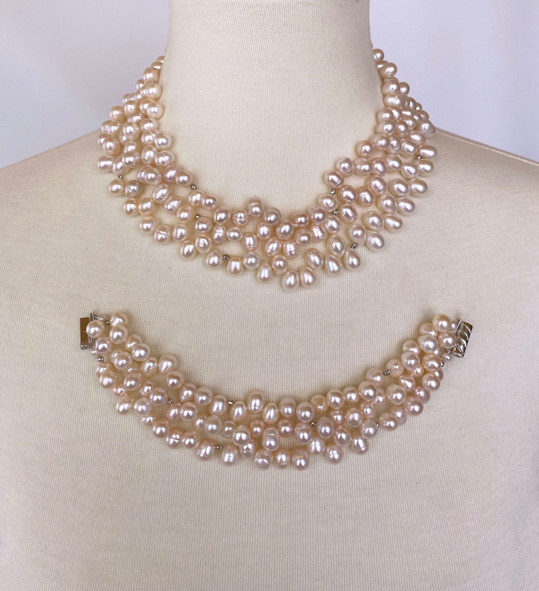 This beautifully crafted piece features Marina J’s uniquely engineered three in one convertible design. As shown in photos, this convertible piece is able to be worn as a long necklace, while also able to be shortened allowing one to pair the shorted necklace with bracelet. Both pieces are easily attached to one another or to themselves through secure sliding 14K White Gold clasps.Featuring gorgeous high luster Dancing Pearls that display a beautiful sheen of Creams and Pinks when hit with light. Dancing Pearls create a playful feel of movement and texture and are perfect for any Bridal or formal occasion. The bracelet measures 7.5 inches, the short Necklace measures 16.5 inches and combined, the Long Necklace measures a total of 24 inches.