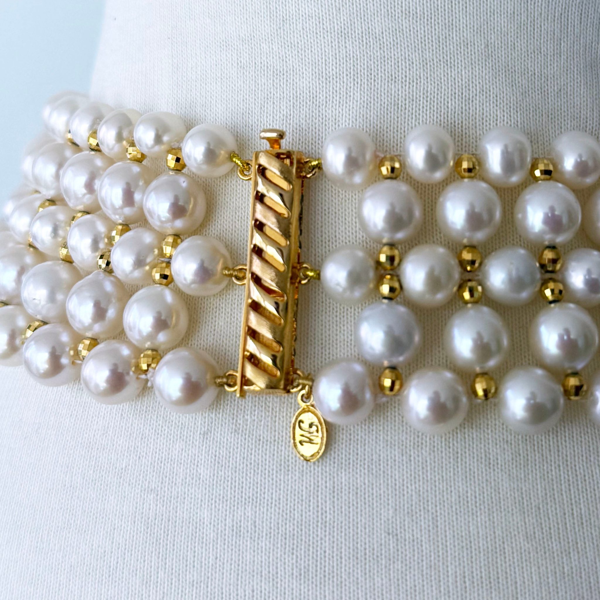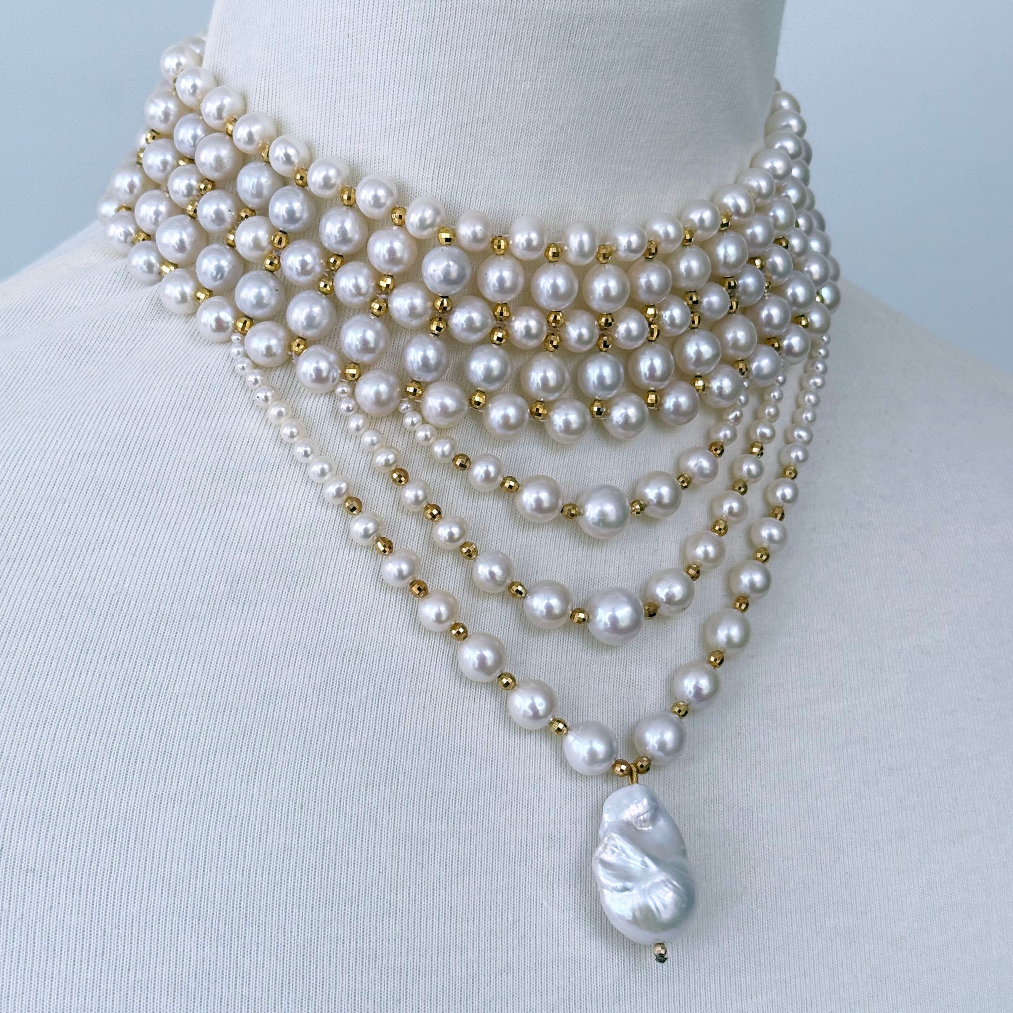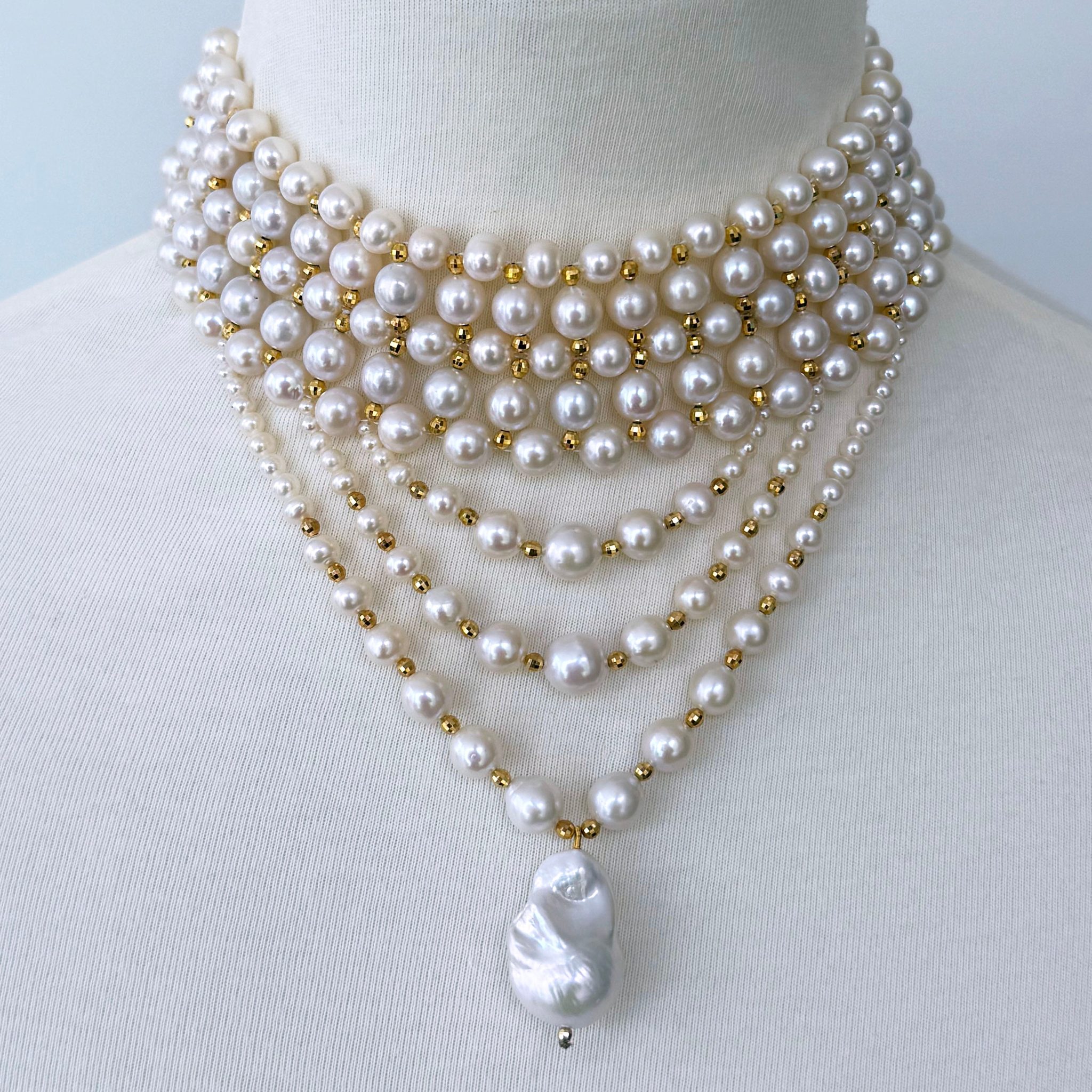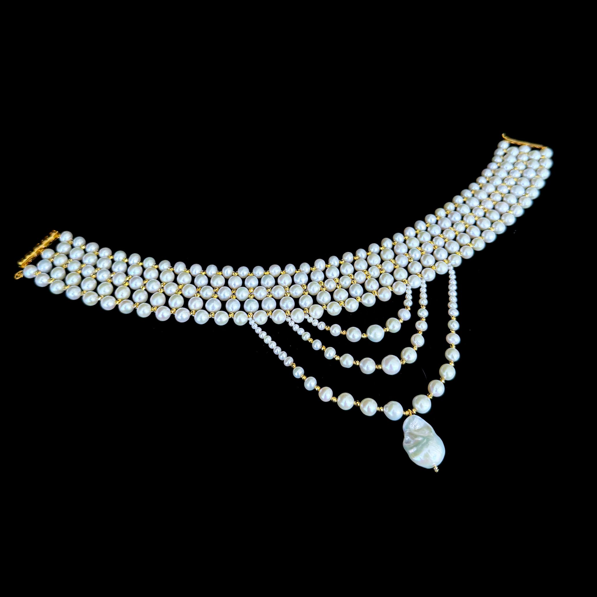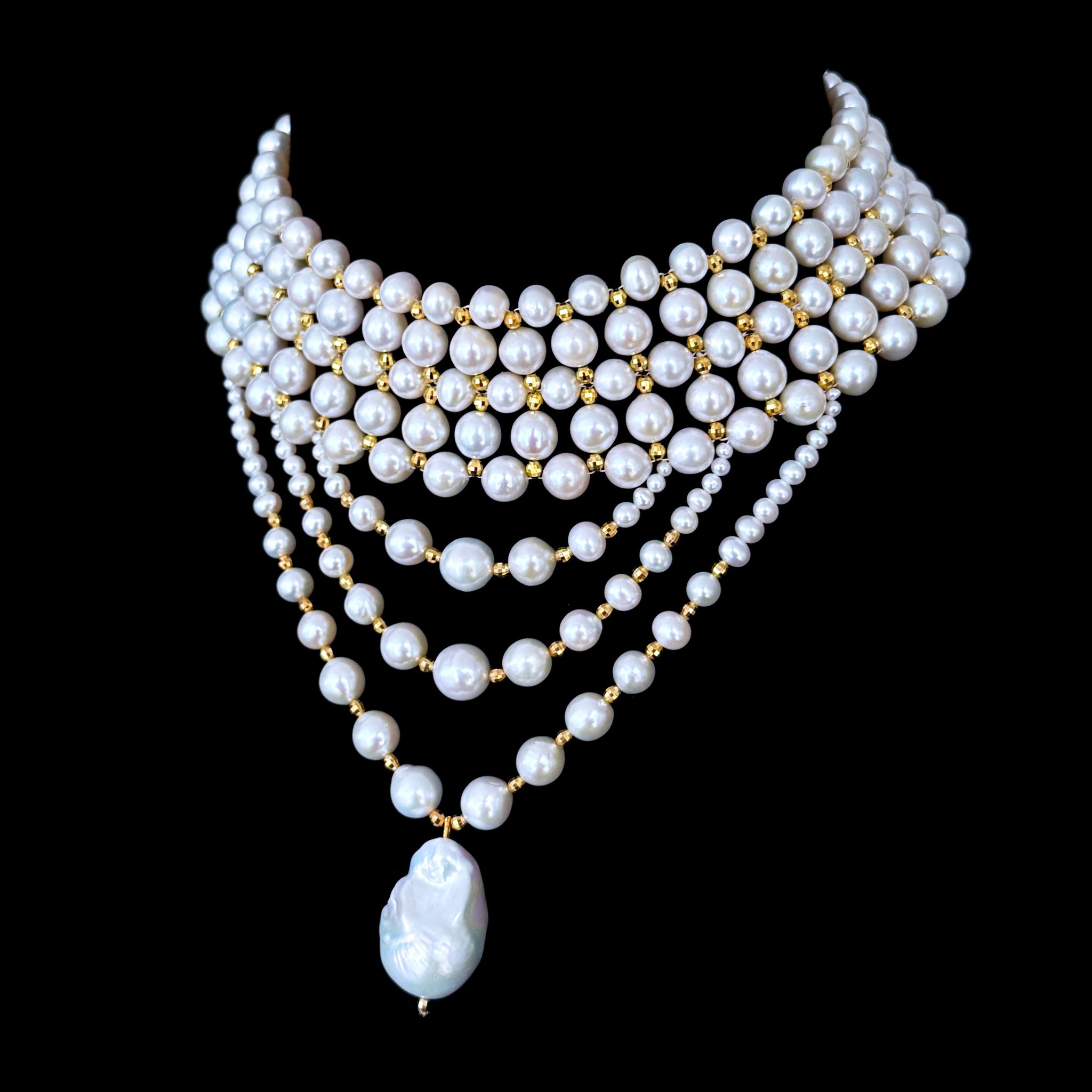 Beautiful piece by Marina J.This piece is inspired by old world royal Victorian jewelry. A Stunning Pearl woven choker accented by Faceted 18k Yellow Gold Plated silver Beads throughout. This choker is complimented by three elegant and graduated strands of Draped Pearls all adorned with the same Faceted 18k Yellow Gold Plated silver beads. The longest drape frames a high luster Baroque Pearl, which stands as the perfect Centerpiece. Measuring a total of 16.5 inches long, this choker meets at an 18k Yellow Gold Plated Decorative Sliding silver Clasp, whose finish matches the beads woven throughout this choker. A stunning statement piece perfect for any formal & Bridal event!