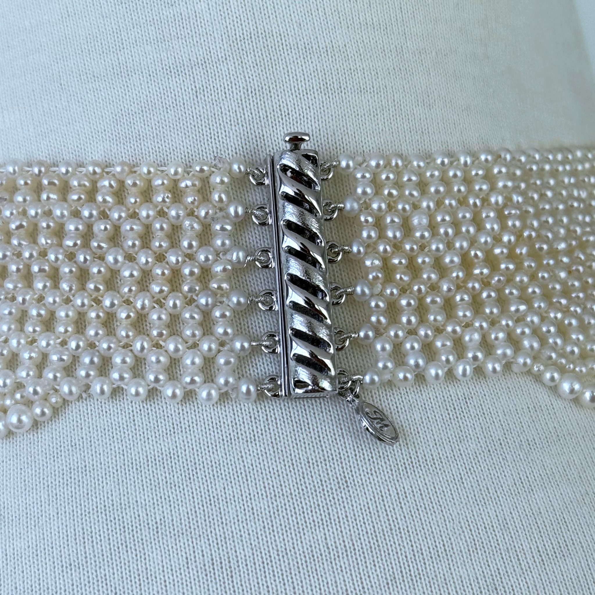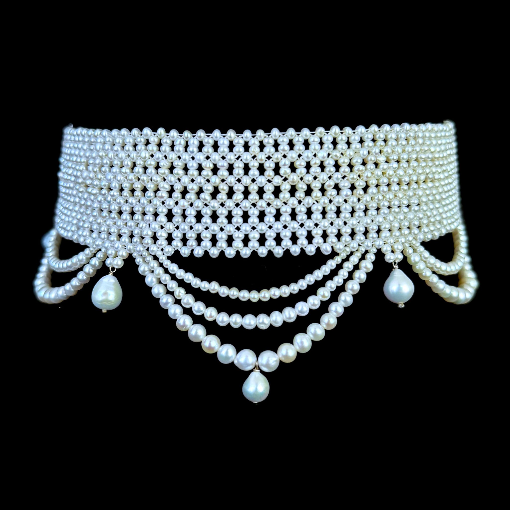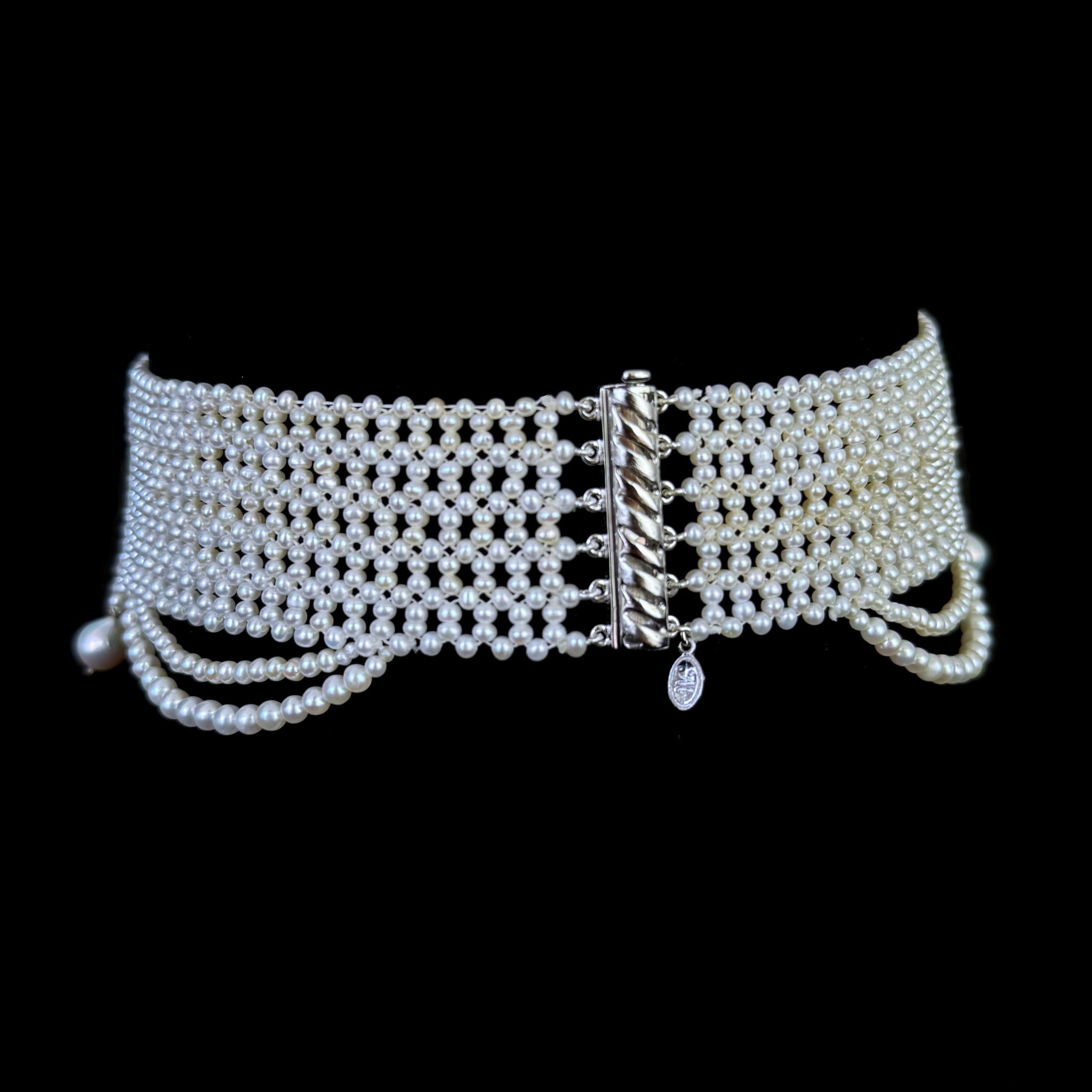 This beautiful handwoven pearl choker has pearls from 2.5mm to 3mm. The necklace is intricately handwoven to create a “lace like” design. The Choker is tapered in design to fit along the curve of the neckline. The clasp is made of rhodium plated sterling silver and slides very smoothly.