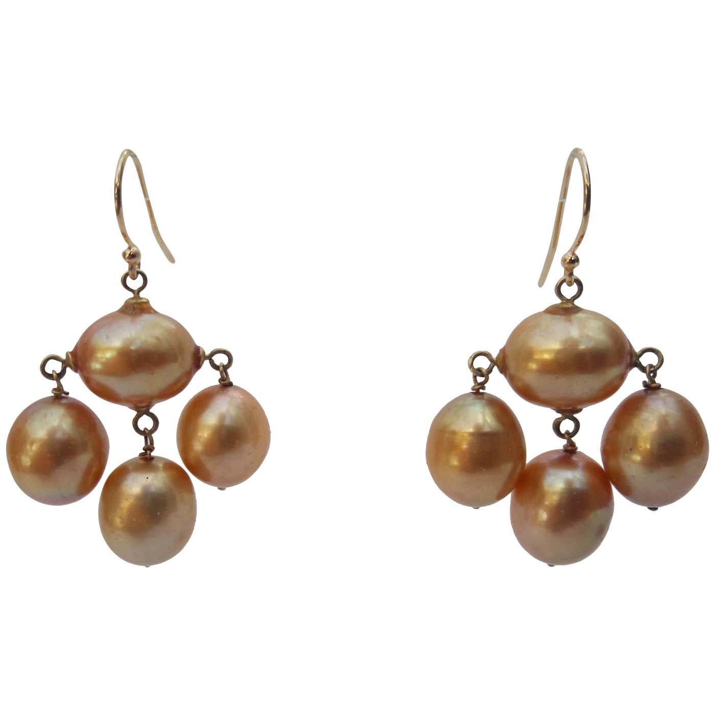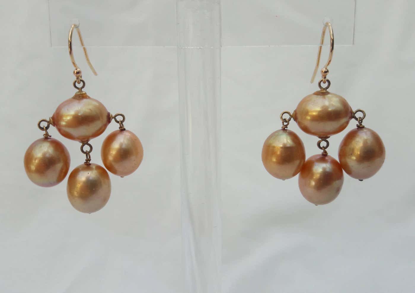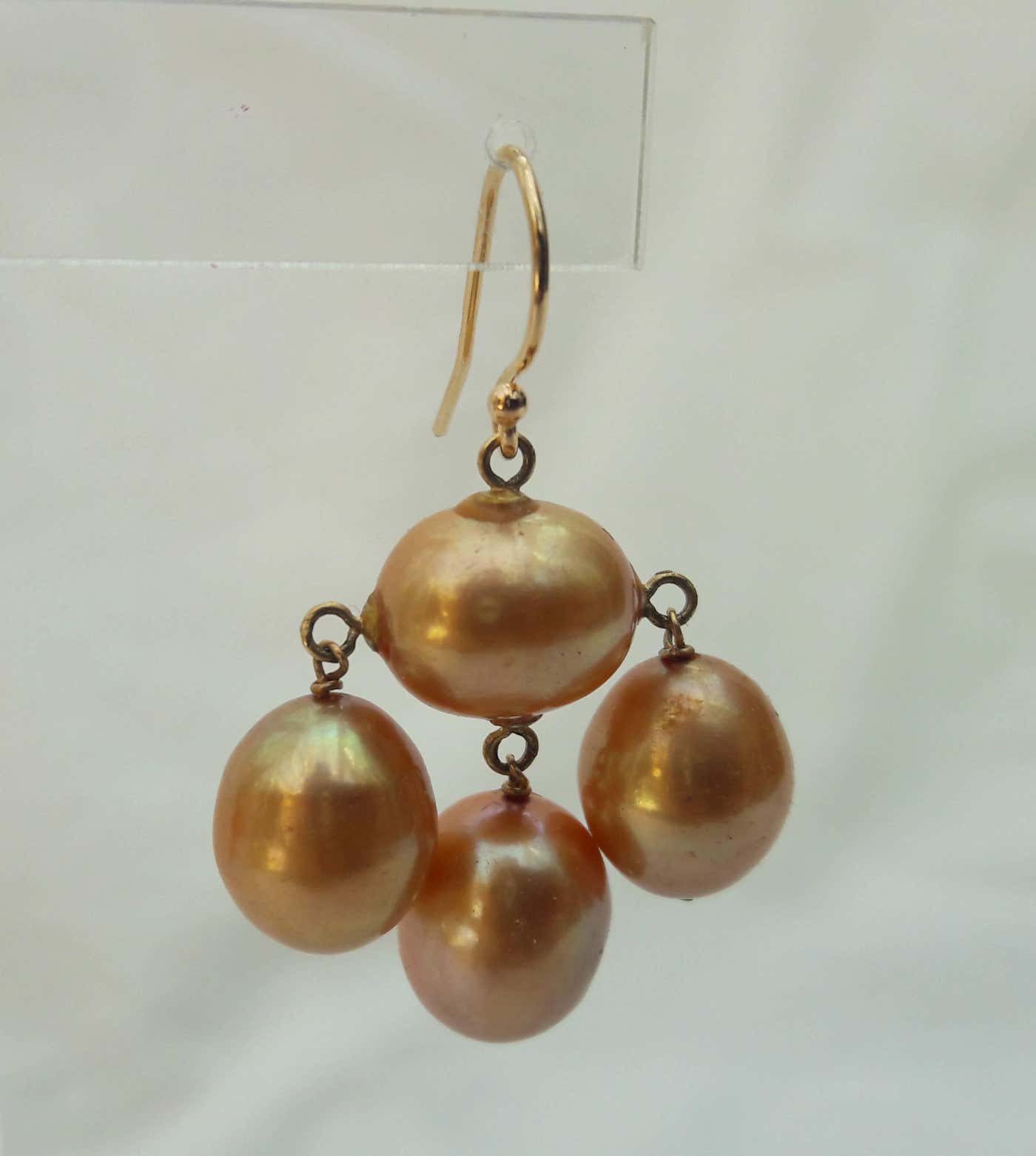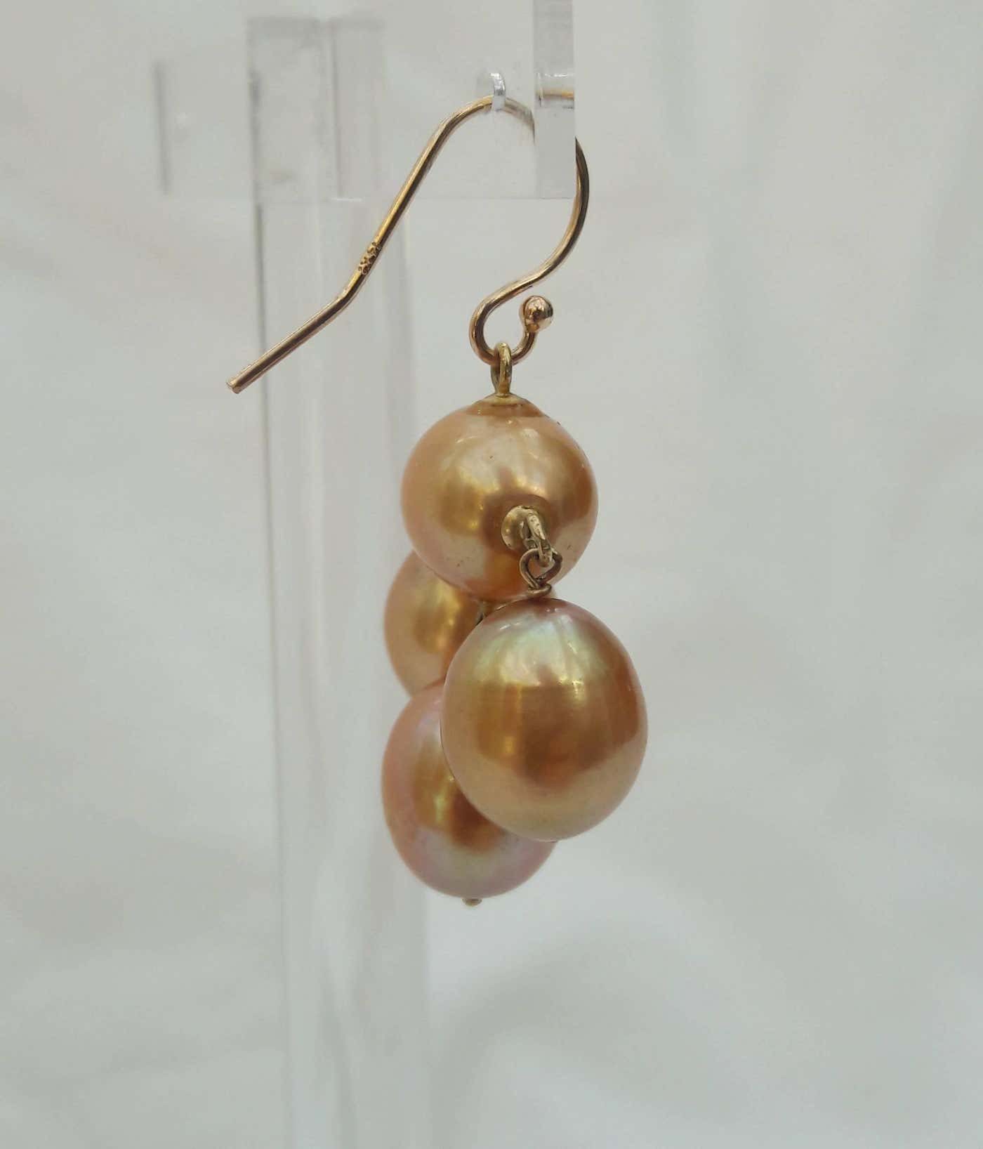 Inspired by by the soft curves and fine lines of the 1920’s Art Deco era. Glamorous and mysterious; the large, oval, golden-hued pearls almost appear to radiate light from within. Three oval pearls, connected by 14 K yellow gold earwire, dangle from a center Pearl. Timeless and elegant. Matches any ensemble. Perfect for bridal and other formal occasions.