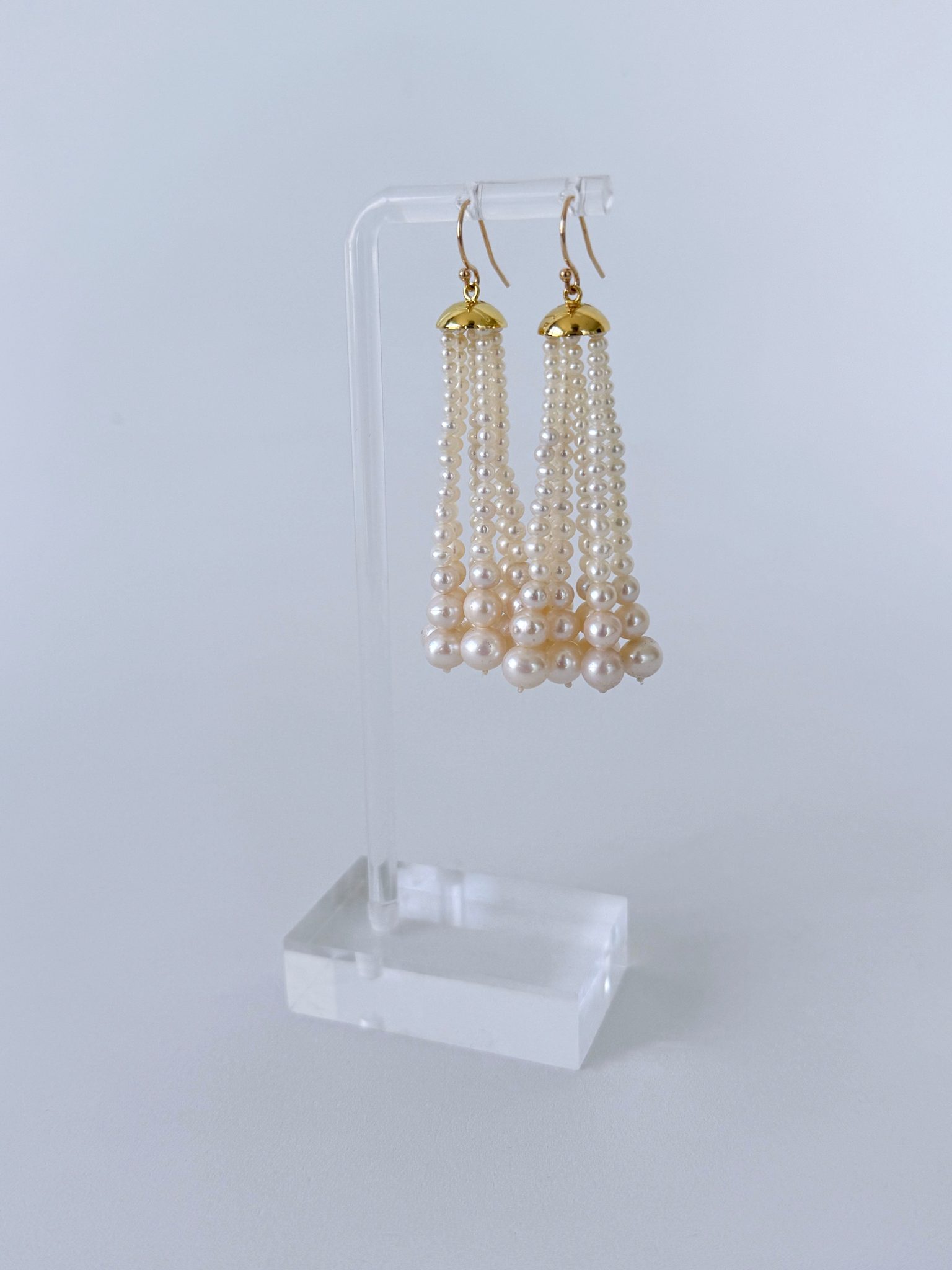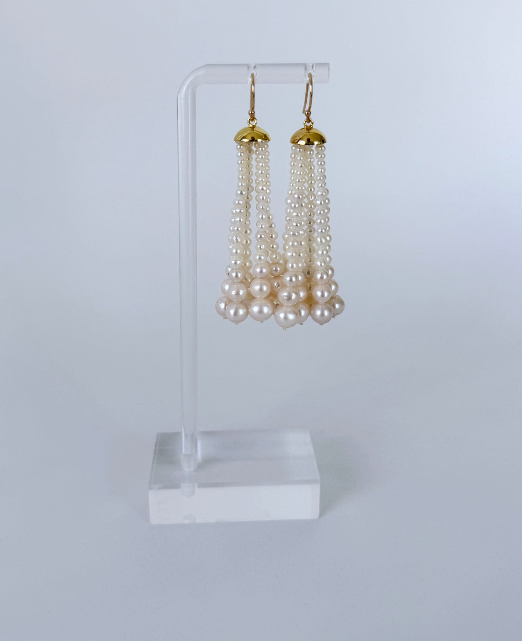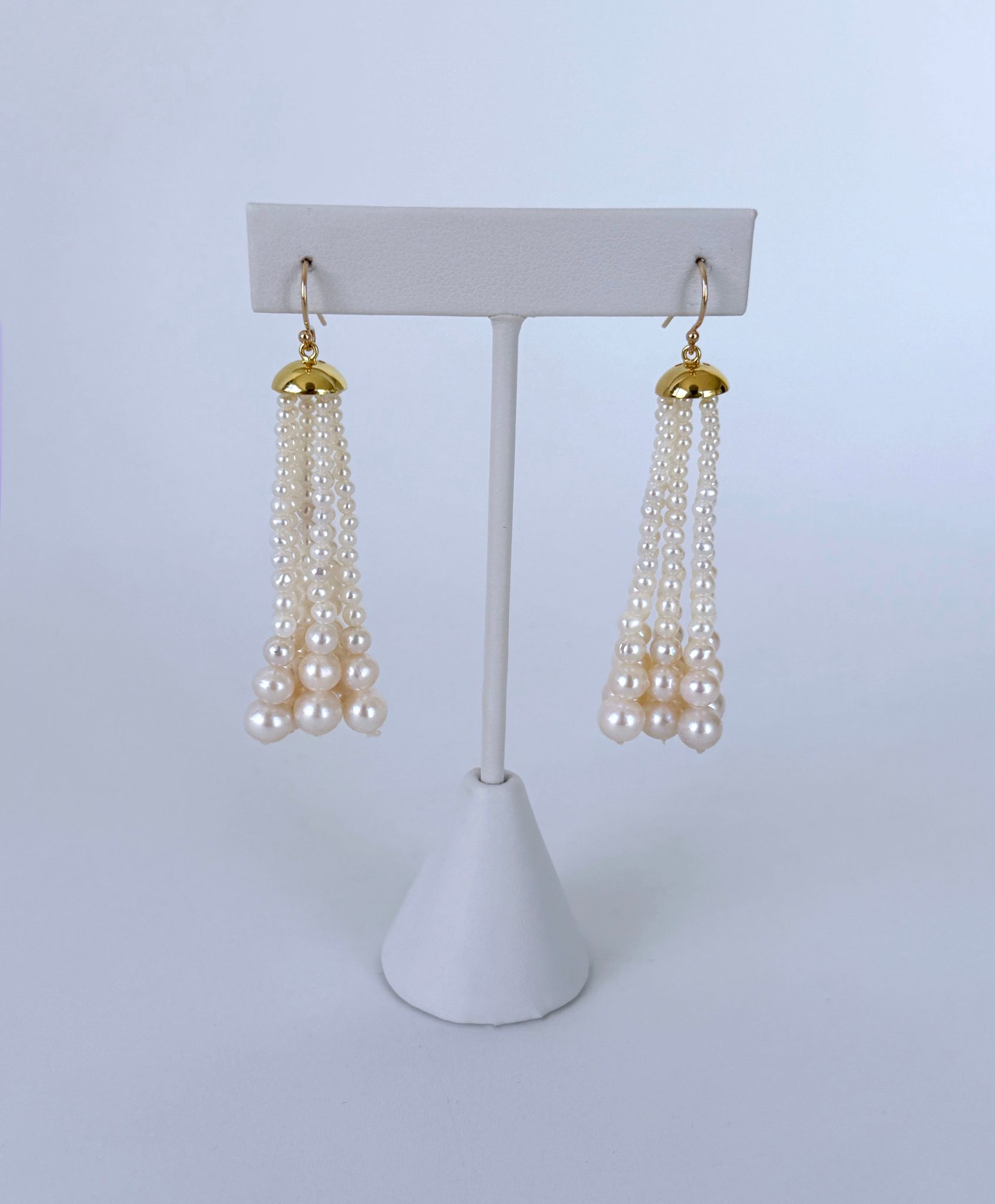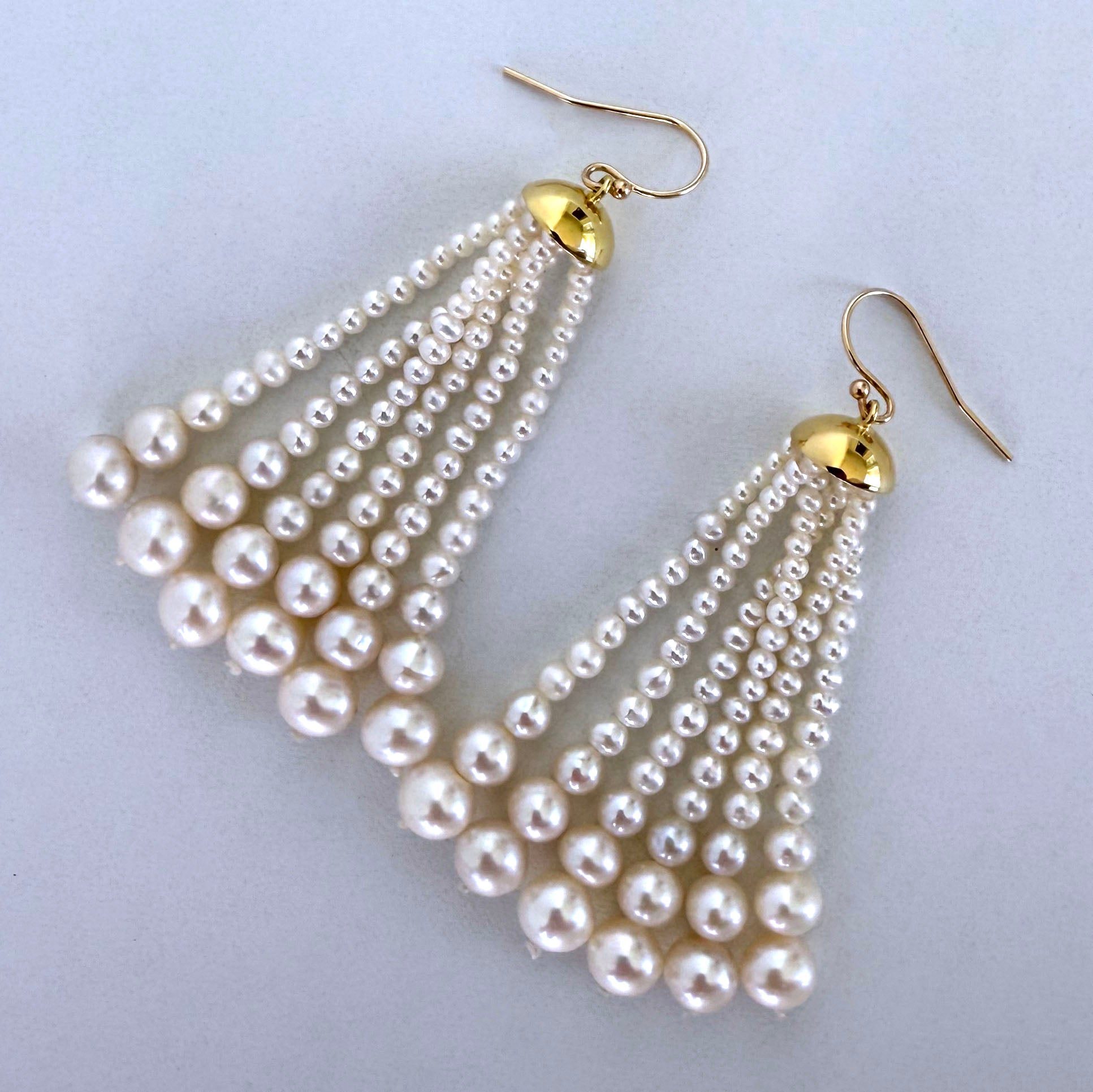 This pair features 18k Gold Plated Cups from which multiple strands of Graduate Pearls hang. Measuring 2.5 inches long, this pair hangs off Solid 14k Yellow Gold Hooks that perfectly match the cups. A great pair of Earrings for any formal evening or Bridal event.