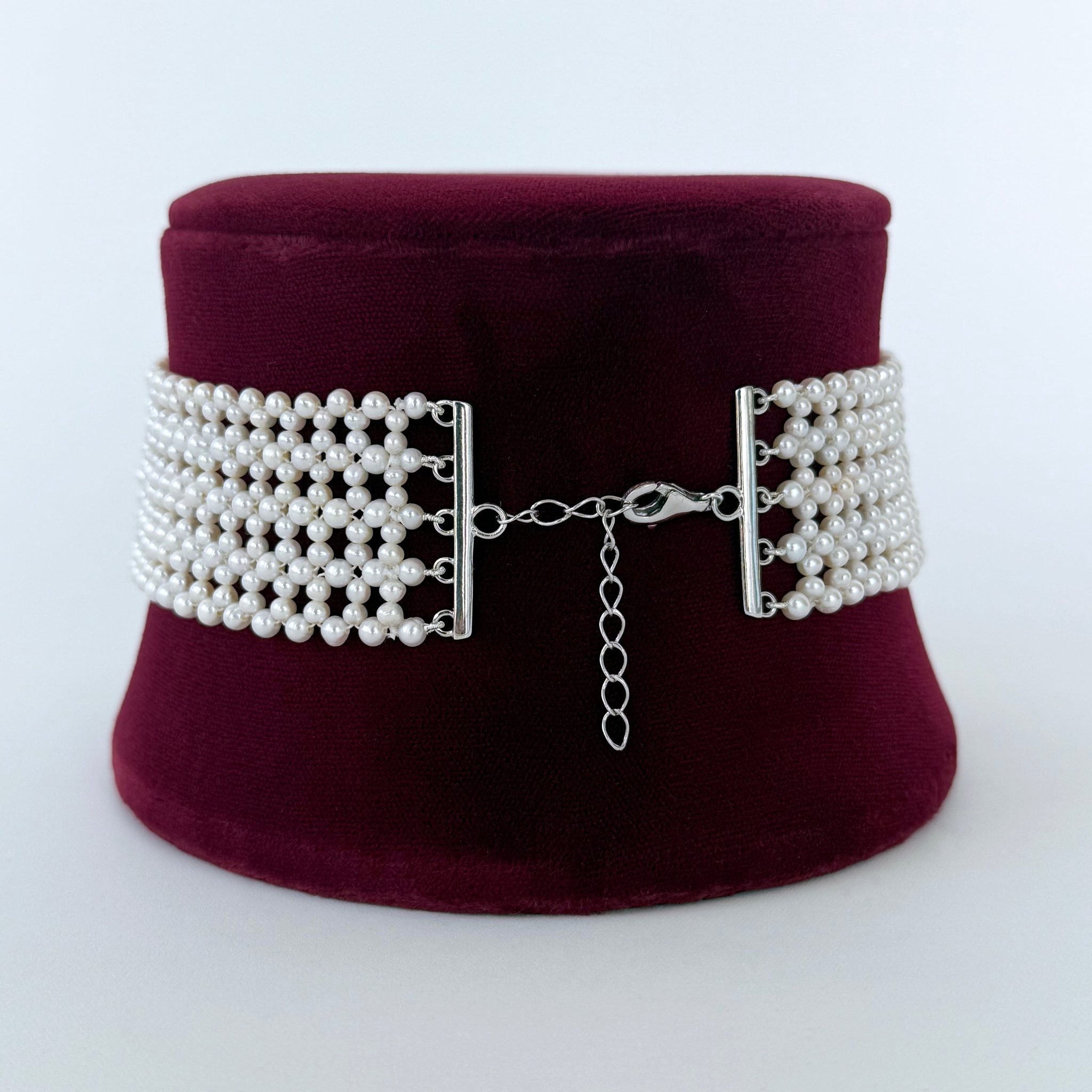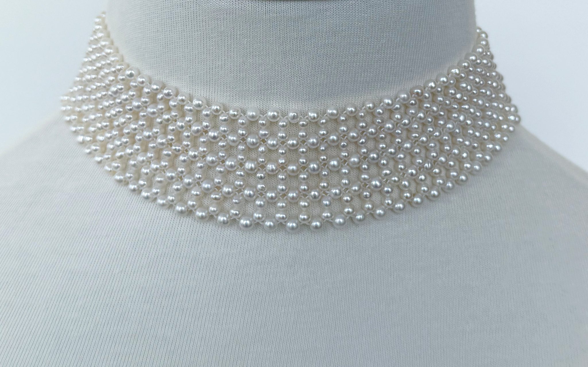 Classic, Timeless Choker by Marina J.This piece is is made with all Seed Pearls intricately woven into a stunning Lace like design, inspired by old world and Victorian jewelry. This piece meets at a Rhodium plated Adjustable clasp allowing for this choker to measure between 12 – 14 inches long. Rhodium plating over Silver ensures a permanent polish that will never tarnish! This piece is woven with the slightest graduation allowing the Choker to sit perfectly along the natural curve of the neck. A perfect piece for any Bridal or formal occasion.
