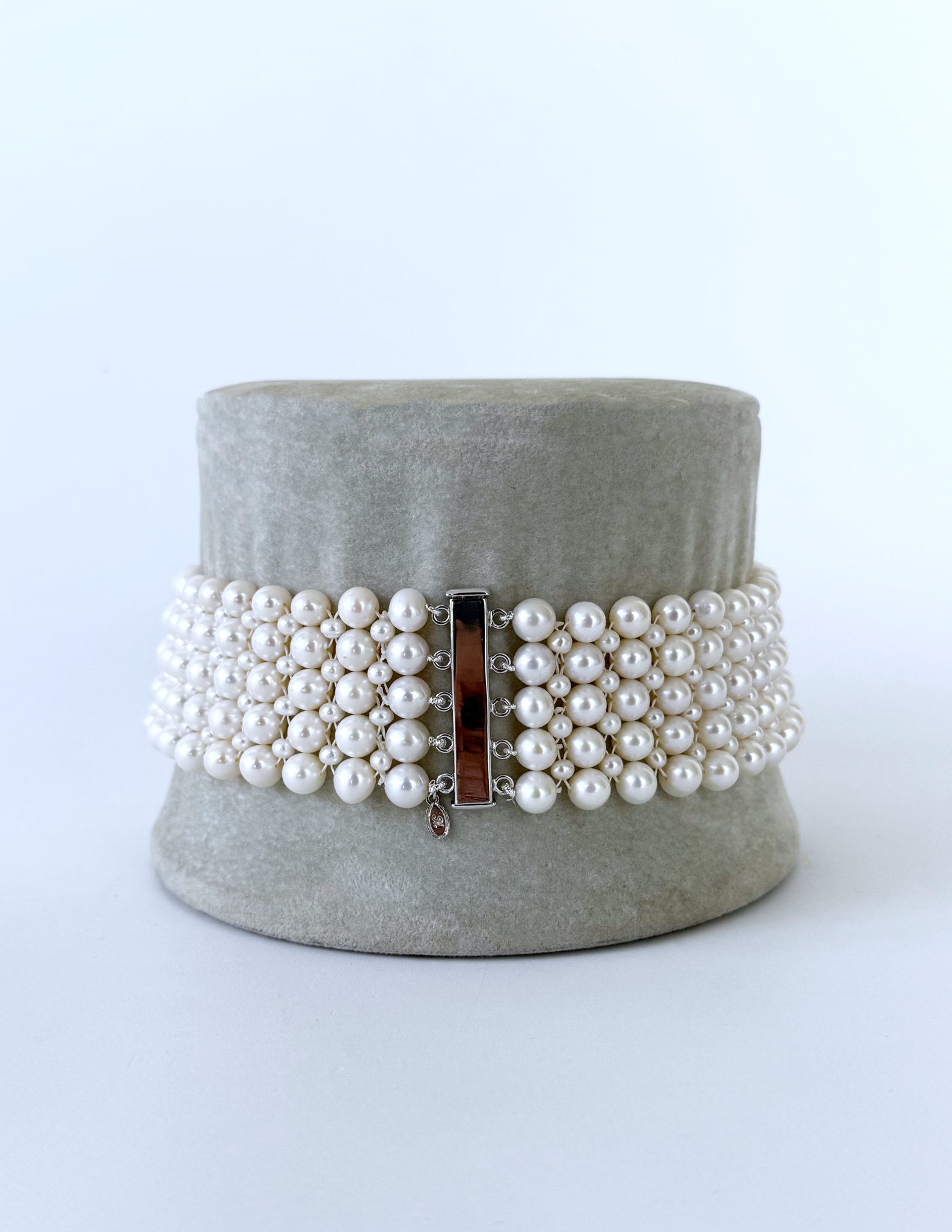 This piece is made with all Pearls & Seed Pearls woven together into a tight Column like design. A stunning and regal piece. This Choker is woven with a slight graduation making it to naturally curve with the neck and allowing it to be worn comfortable. Measuring 1.25 inches wide and 13.5 inches long, this Choker meets at a high shine Silver Sliding Magnetic Clasp that is Rhodium plated. Rhodium plating ensures that tarnish will never occur, allowing the clasp to remain high shine forever. A amazing piece for any Bridal or formal event.
