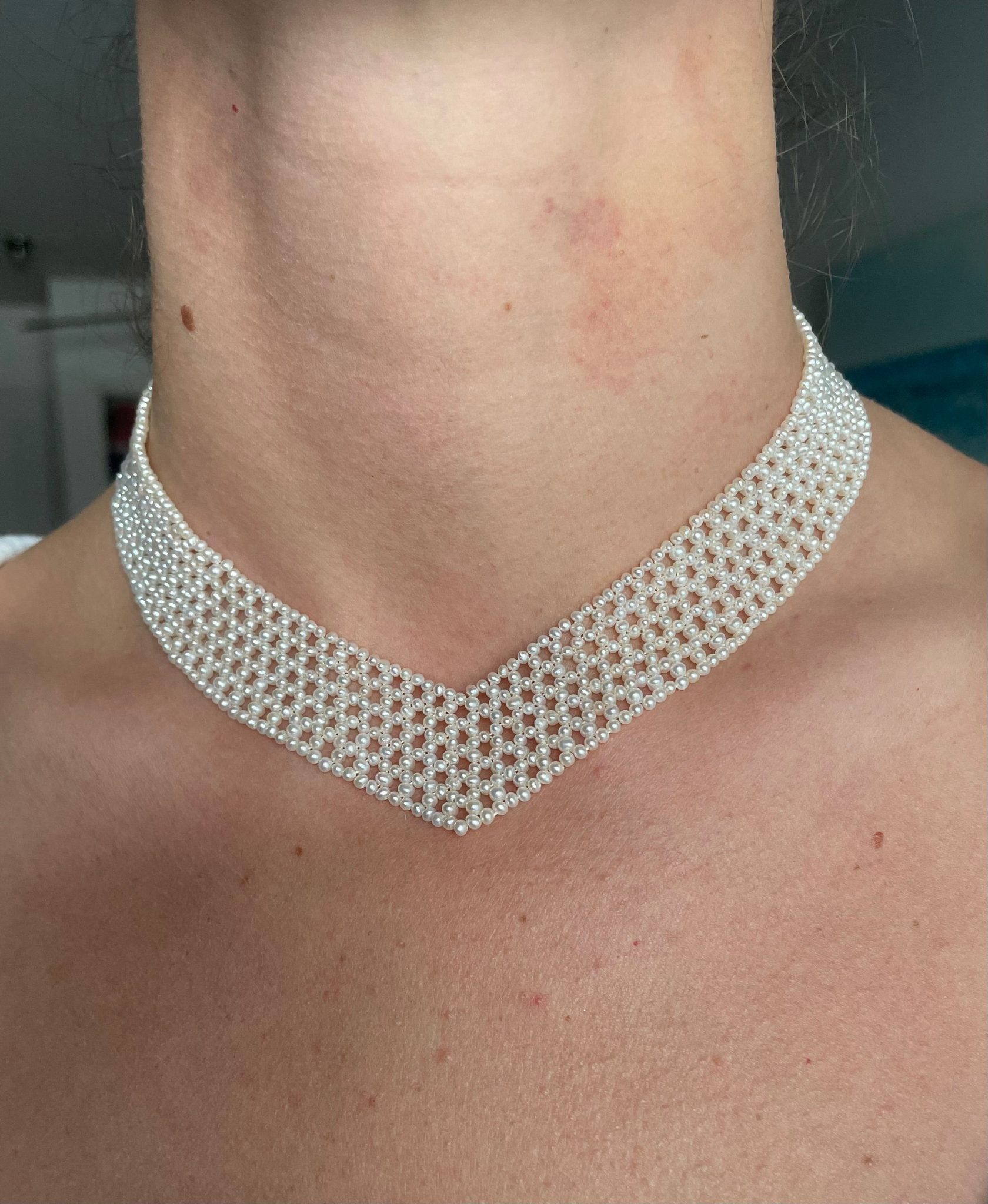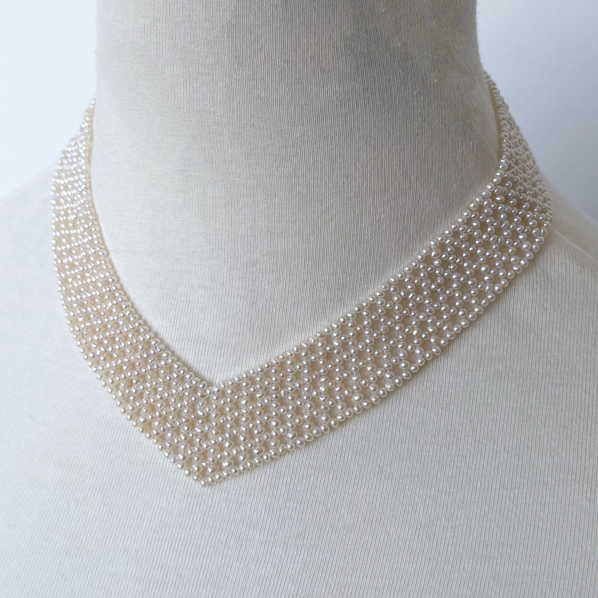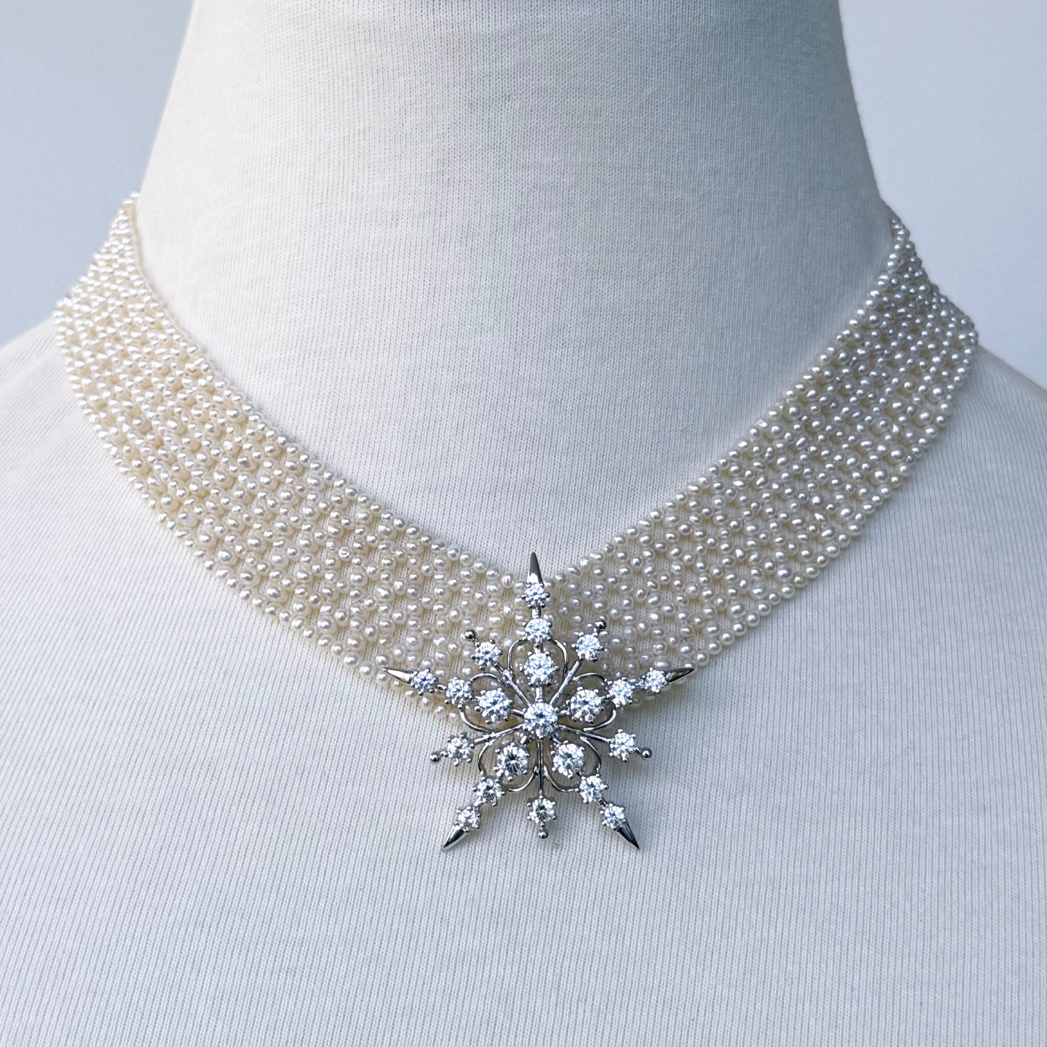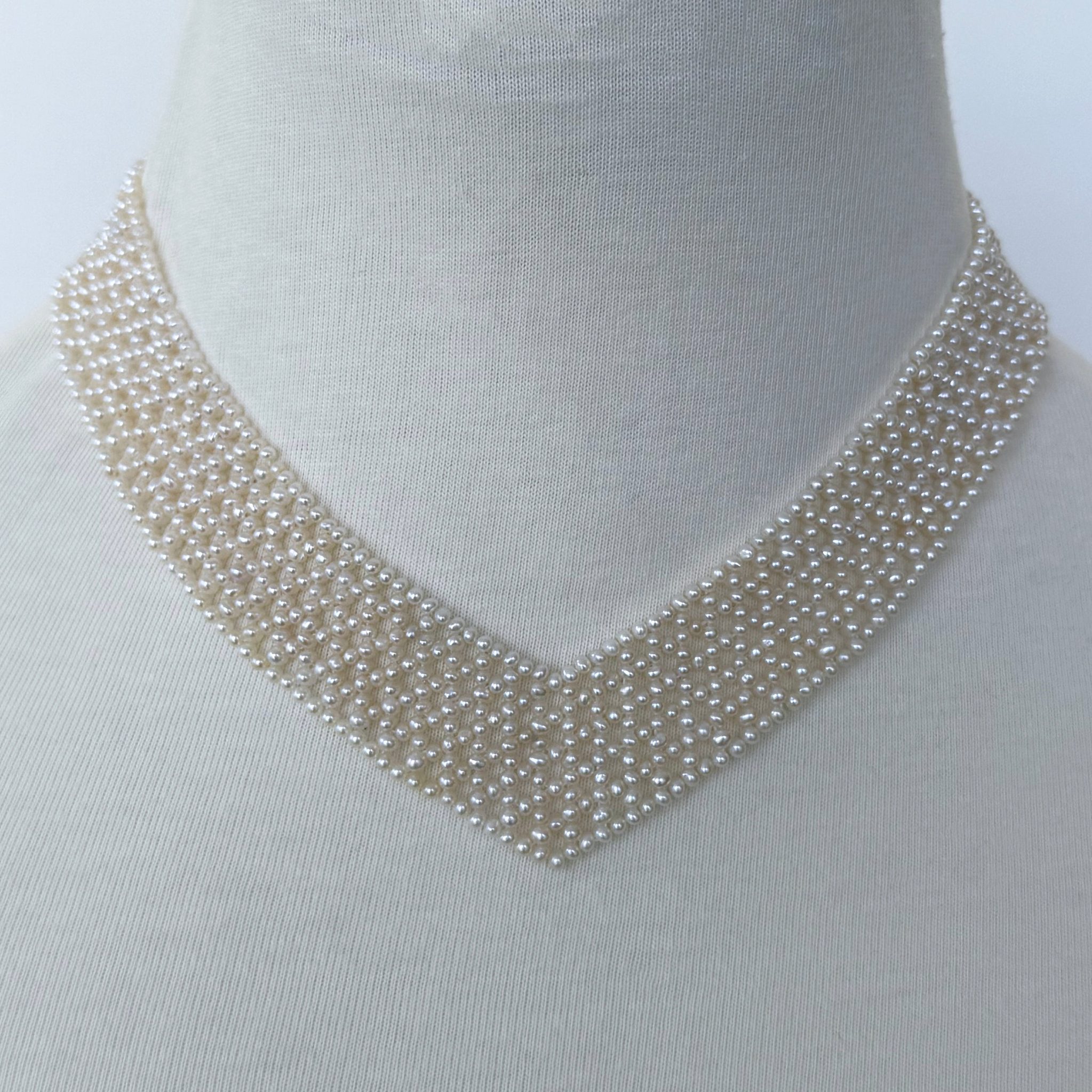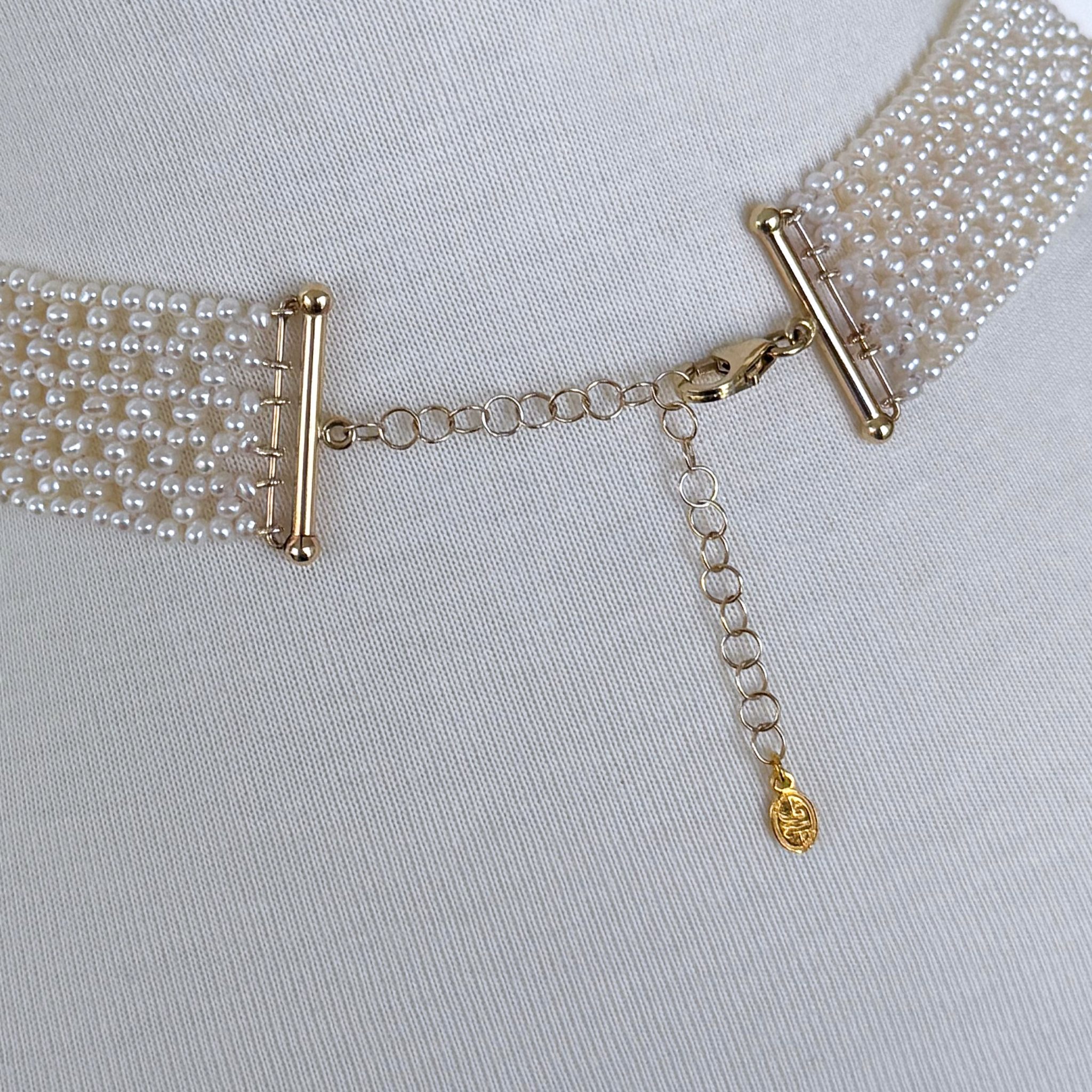 Gorgeous piece by Marina J. This necklace features all real cultured White Pearls intricately woven together into a tight lace like design. Woven into a ‘V” shape, this piece perfectly accentuates the neck and cleavage. This necklace meets at a Solid 14k Yellow Gold Adjustable [Hand Made] Clasp allowing this piece to measure between 13.5 – 16 inches long. A beautiful piece that is perfect for any Bridal or formal occasion. Brooch not included