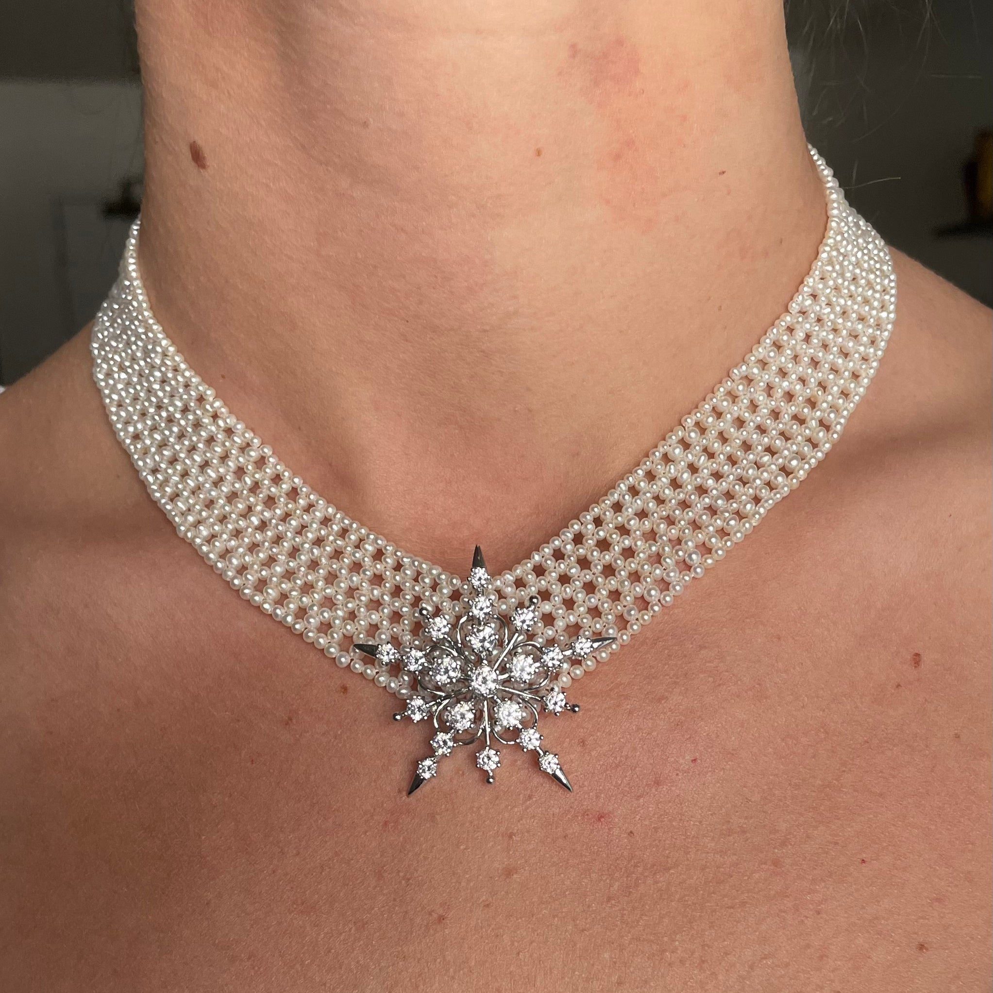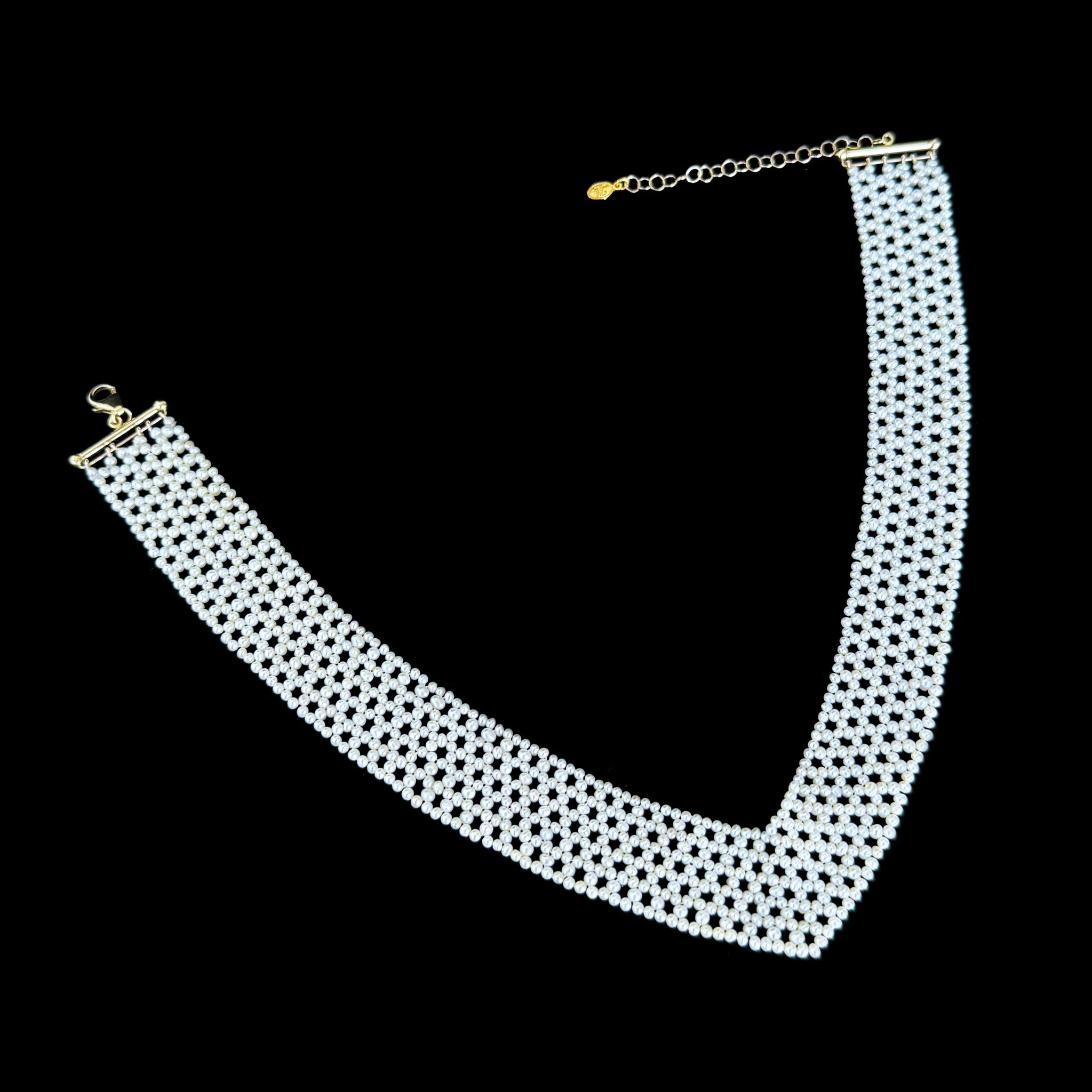 Gorgeous piece by Marina J. This necklace features all real cultured White Pearls intricately woven together into a tight lace like design. Woven into a ‘V” shape, this piece perfectly accentuates the neck and cleavage. This necklace meets at a Solid 14k Yellow Gold Adjustable [Hand Made] Clasp allowing this piece to measure between 13.5 – 16 inches long. A beautiful piece that is perfect for any Bridal or formal occasion. ** Brooch not included **