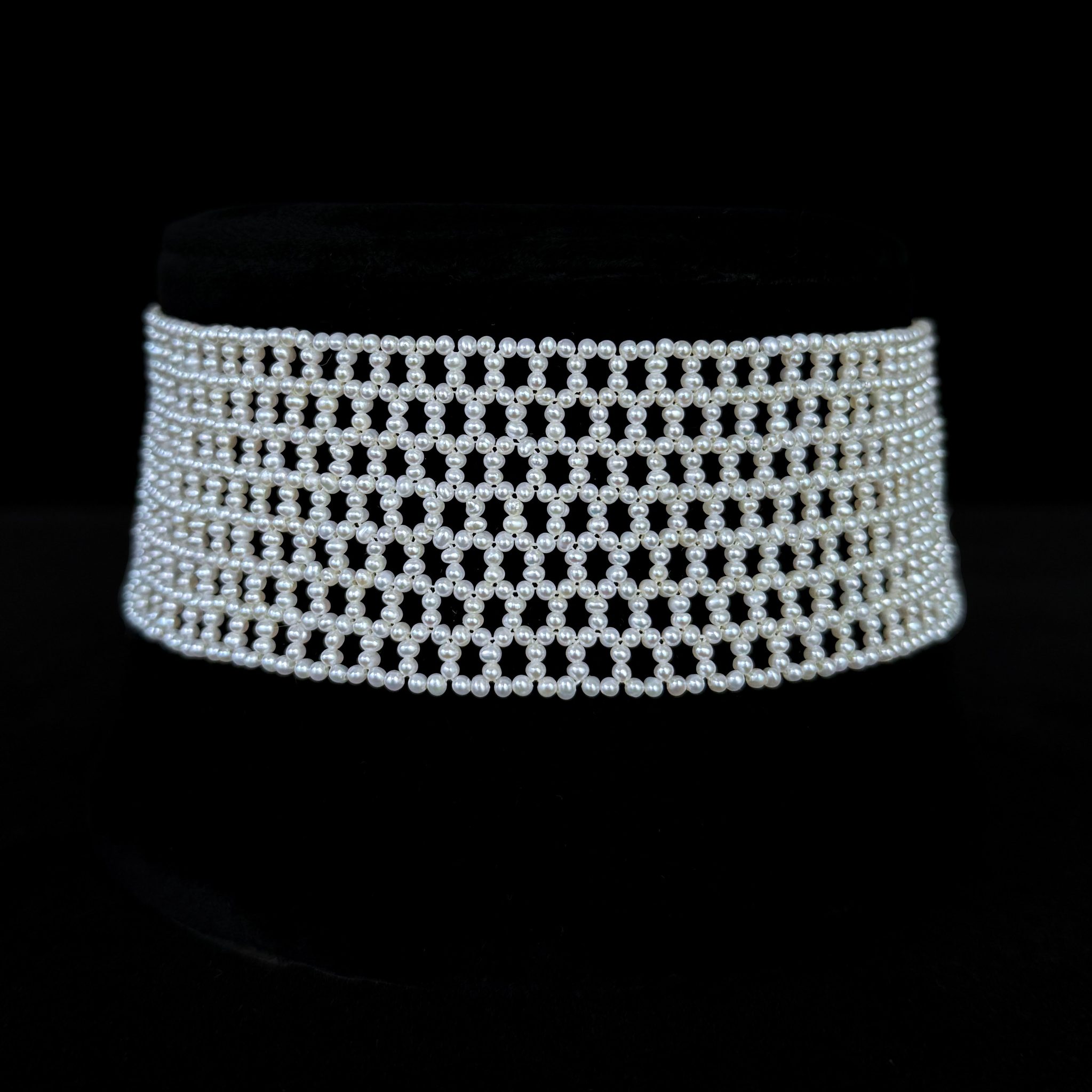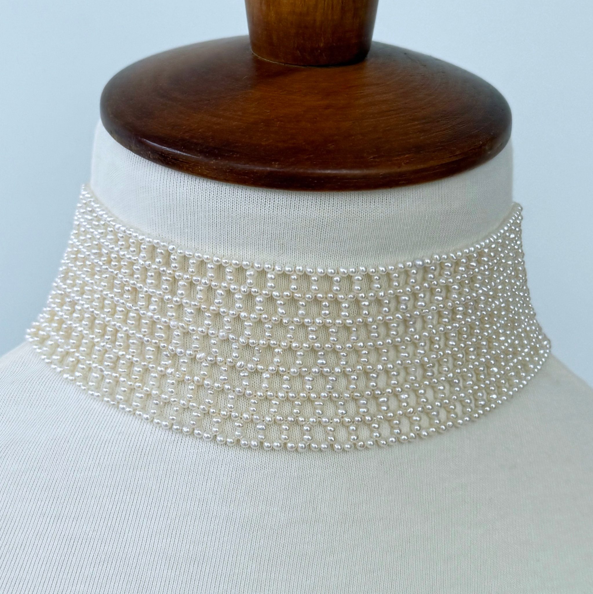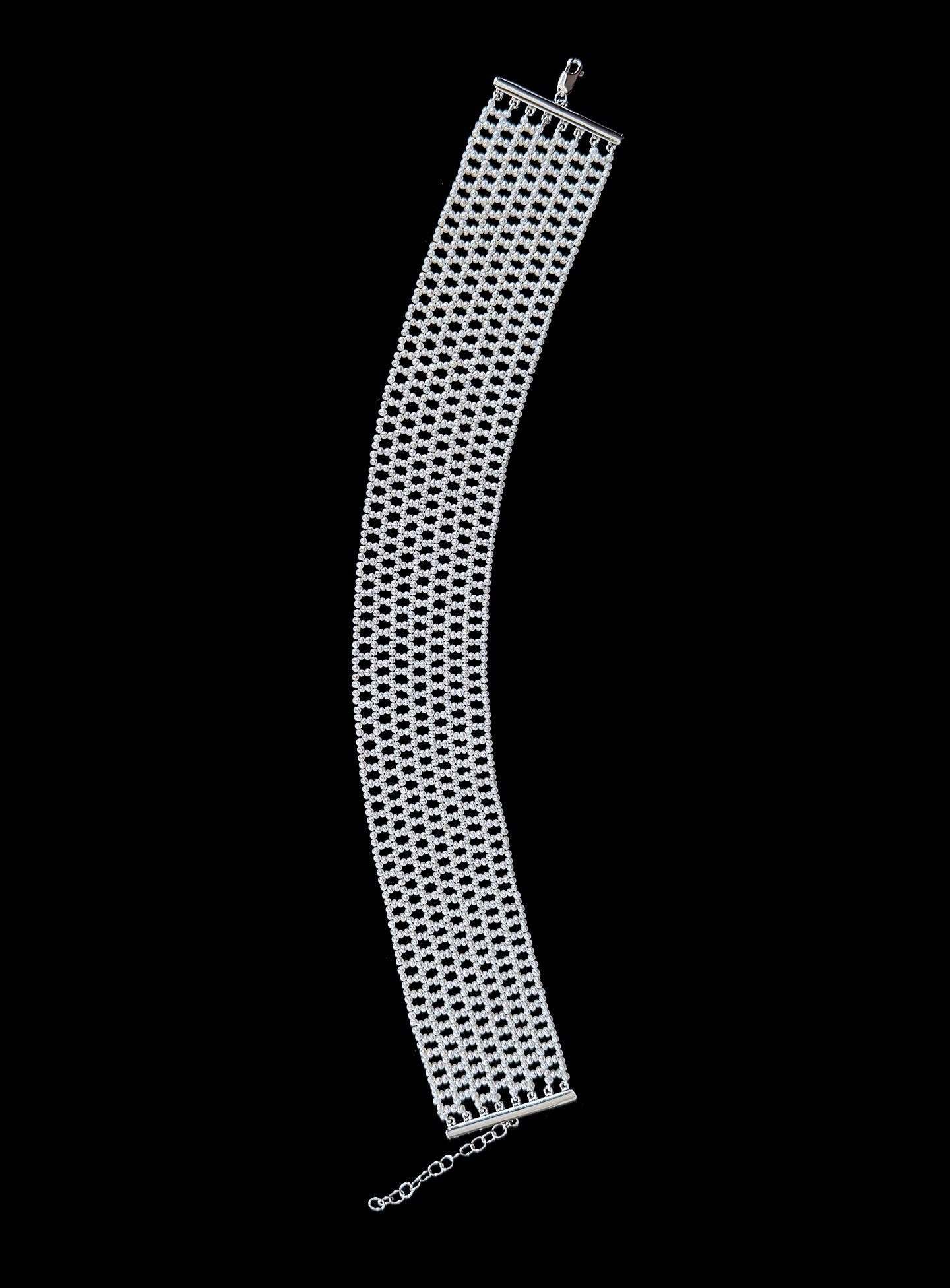 Classic, Timeless Choker by Marina J.This piece is is made with all Seed Pearls intricately woven into a stunning Lace like design, inspired by old world and Victorian jewelry. Measuring 1.5 inches wide, this Choker meets at a Rhodium plated Silver Adjustable Lobster Clasp (stamped 925) allowing this Choker to measure between 12 and 14.5 inches long. Rhodium plating over Silver ensures a permanent polish that will never tarnish! This piece is woven with the slightest graduation allowing the Choker to sit perfectly along the natural curve of the neck. An absolutely beautiful and elegant piece perfect for Bridal and formal occasions. Brooch not included with Choker