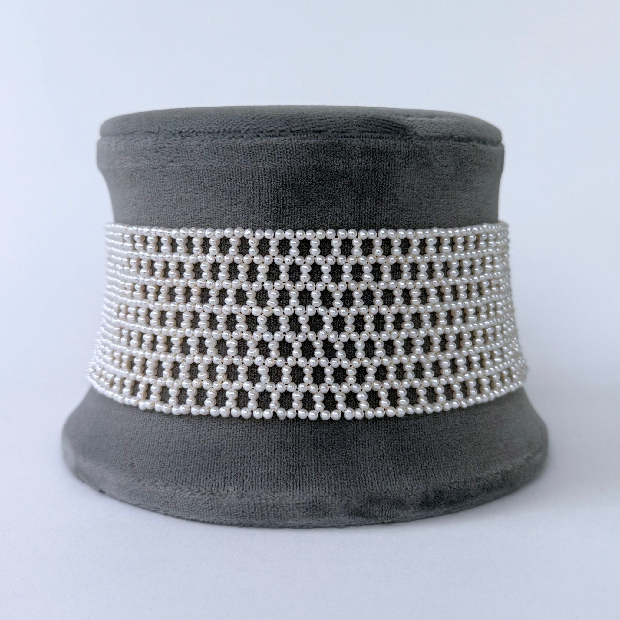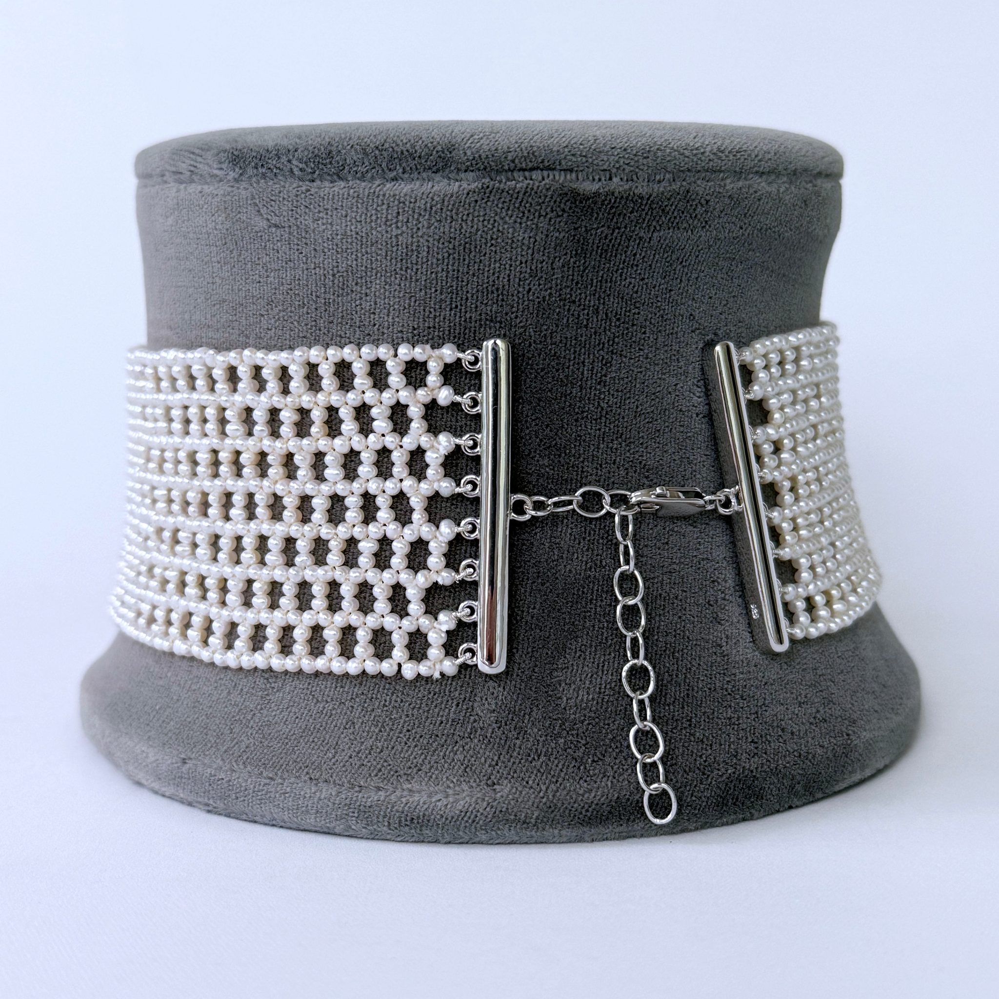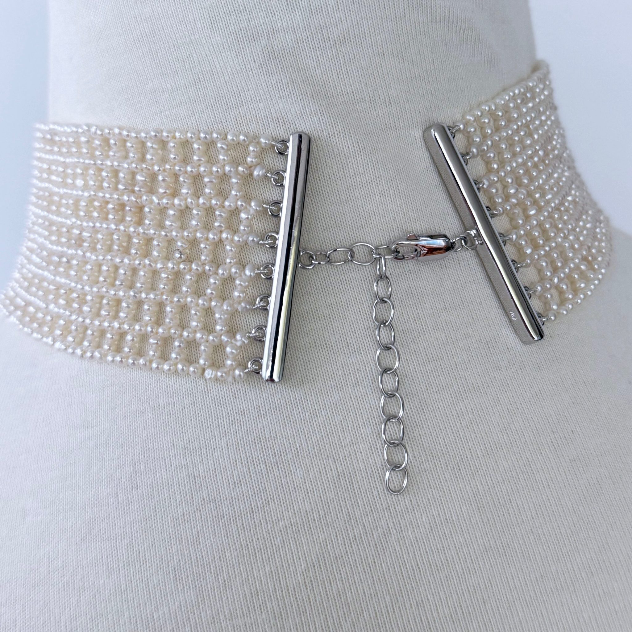 Classic, Timeless Choker by Marina J.This piece is is made with all Seed Pearls intricately woven into a stunning Lace like design, inspired by old world and Victorian jewelry. Measuring 1.5 inches wide, this Choker meets at a Rhodium plated Silver Adjustable Lobster Clasp (stamped 925) allowing this Choker to measure between 12 and 14.5 inches long. Rhodium plating over Silver ensures a permanent polish that will never tarnish! This piece is woven with the slightest graduation allowing the Choker to sit perfectly along the natural curve of the neck. An absolutely beautiful and elegant piece perfect for Bridal and formal occasions. Brooch not included with Choker