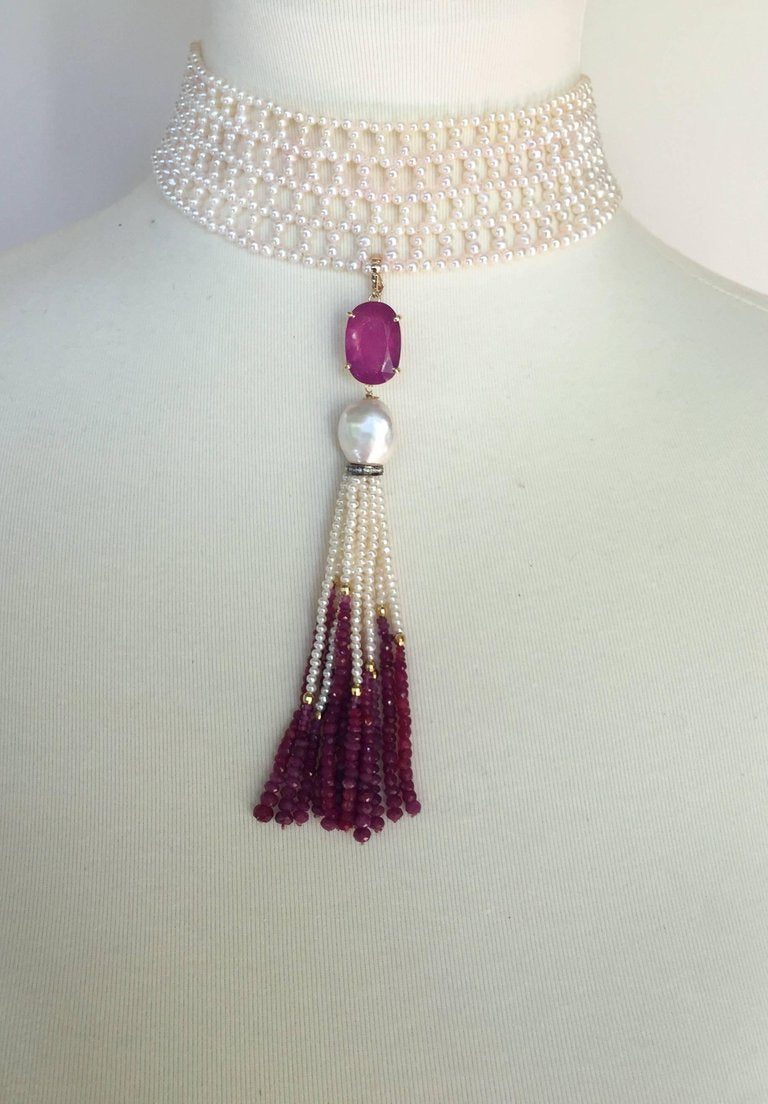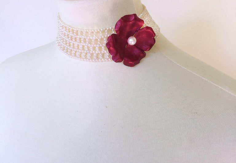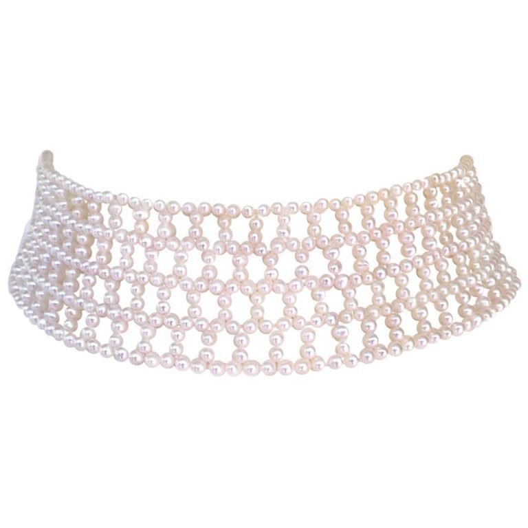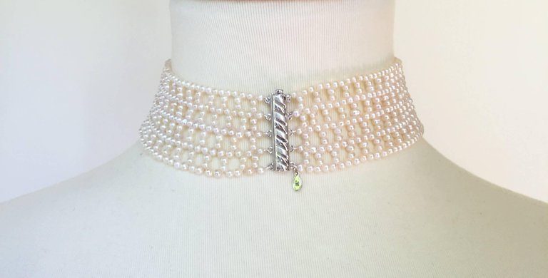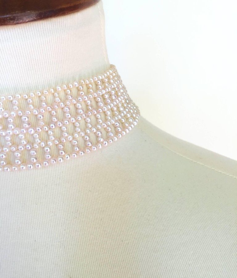 The intricately wide woven white pearl choker is classic with the double stranded 3 mm pearls and 14k white gold clap. Because of the weave of the choker you can change the style by adding any brooch (as seen in images, brooch and tassel not included). The choker curves and is 1.4 inches wide to perfectly fit the curve of the neck. At 13.25 inches long the choker also fits comfortably around the neck. The sliding clasps is 14k white gold plated silver. Marina J.’s design was inspired the traditional pearl weaving of Russia. As a native she finds the elegant lace like designs beautiful. She re-imagines the designs to fit a more modern aesthetic. This timeless pearl woven choker is versatile and can complete any formal or bridal look.