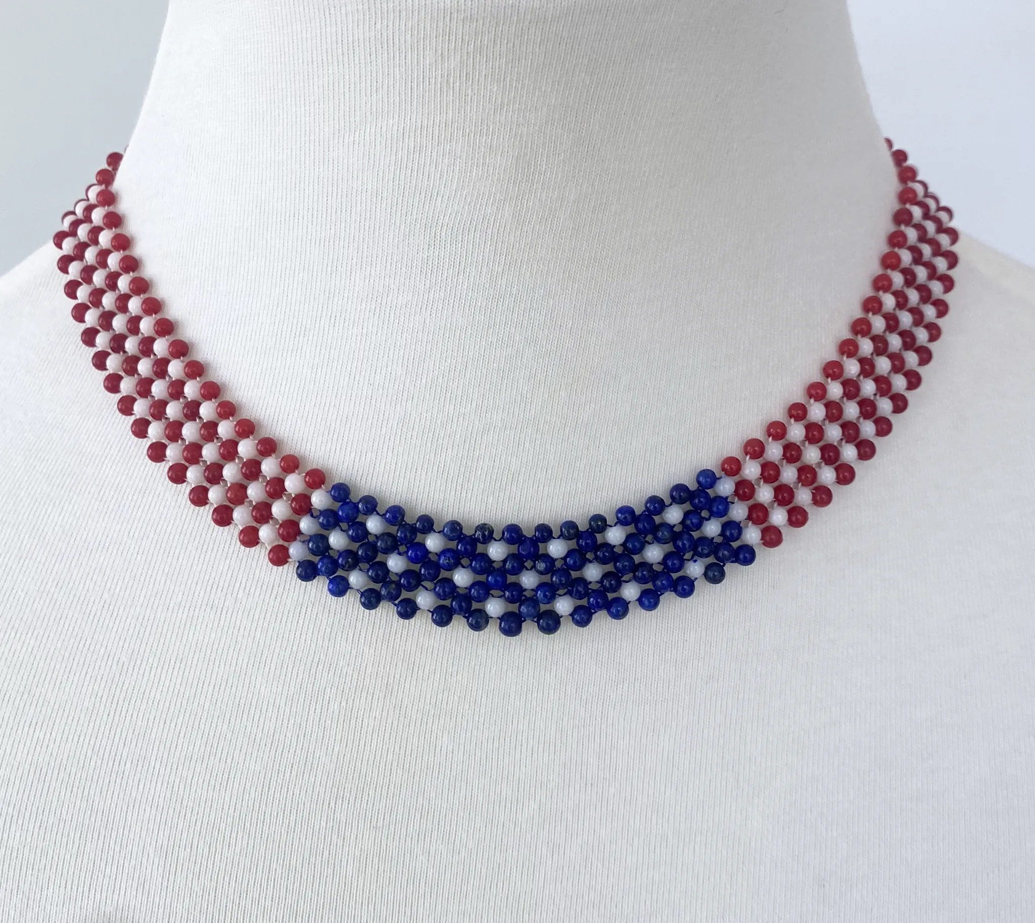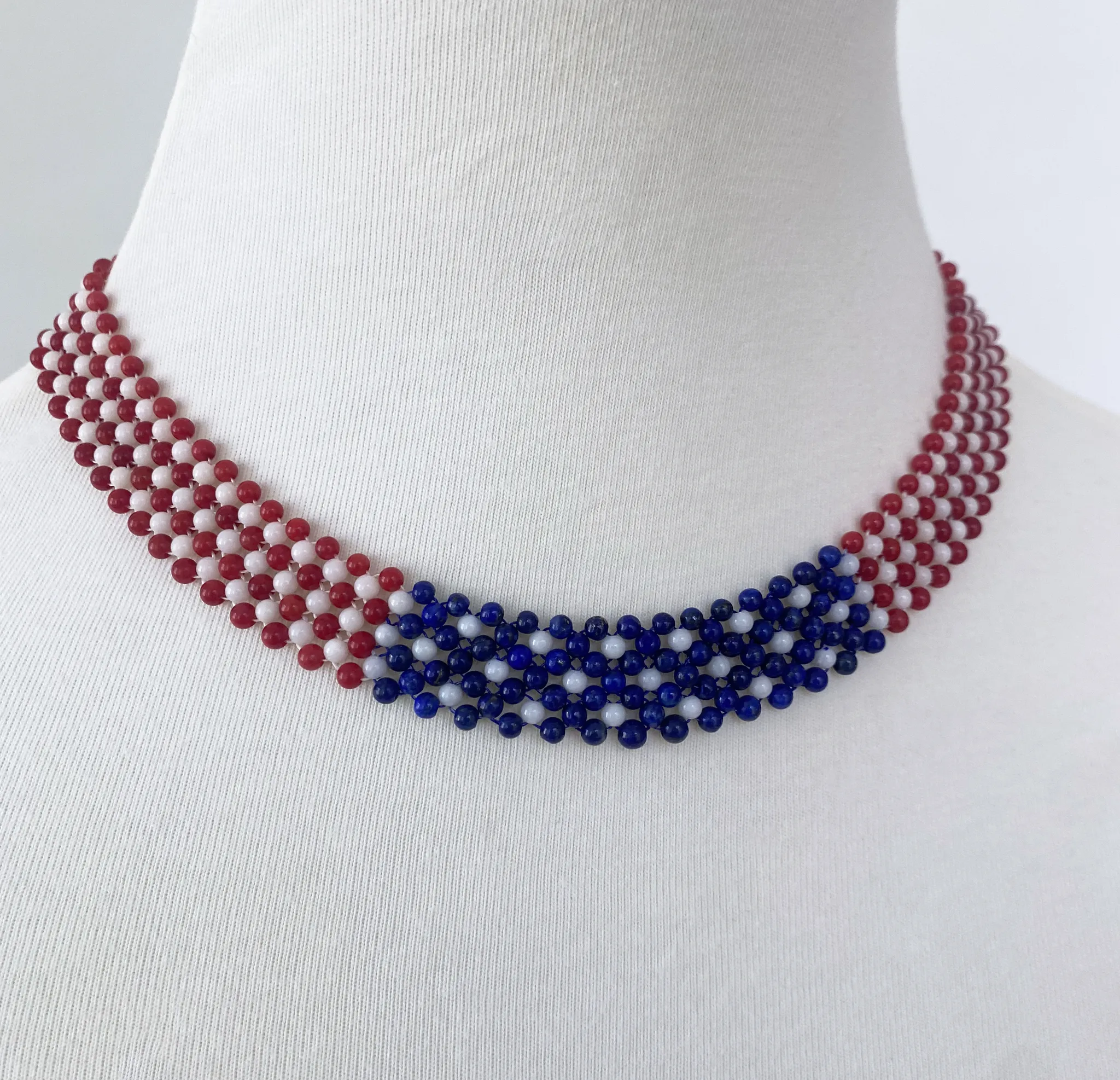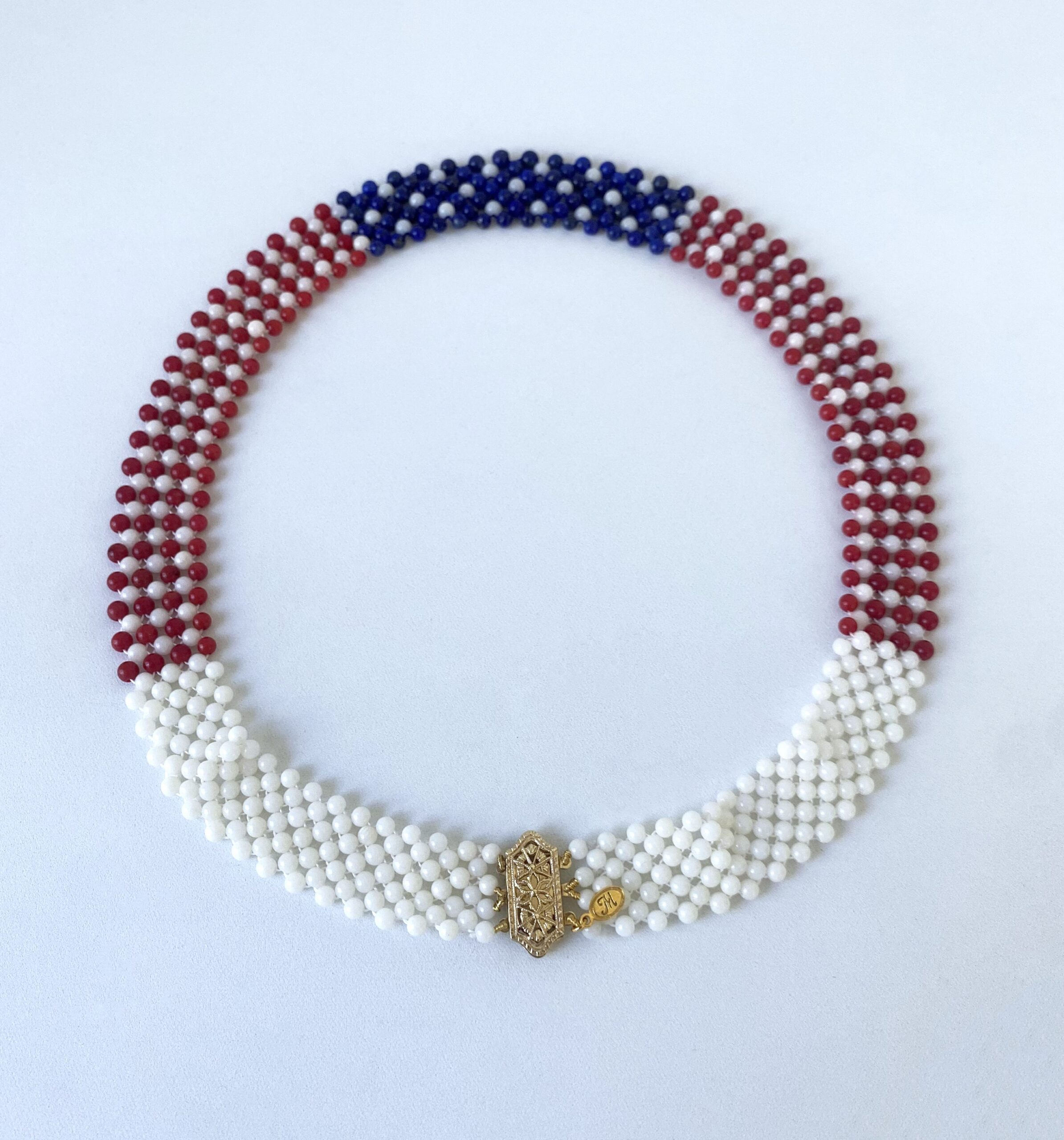 American Flag Woven Necklace by Marina J. This piece is made with all White & Red Coral and Lapis Lazuli all intricately woven together into a lace like design creating a stunning American Flag. Perfect piece for any patriot or showing off your love for the country. This Necklace measures 16 inches long and meets at a solid 14k Yellow Gold Decorative Filigree Clasp (marked 14k).