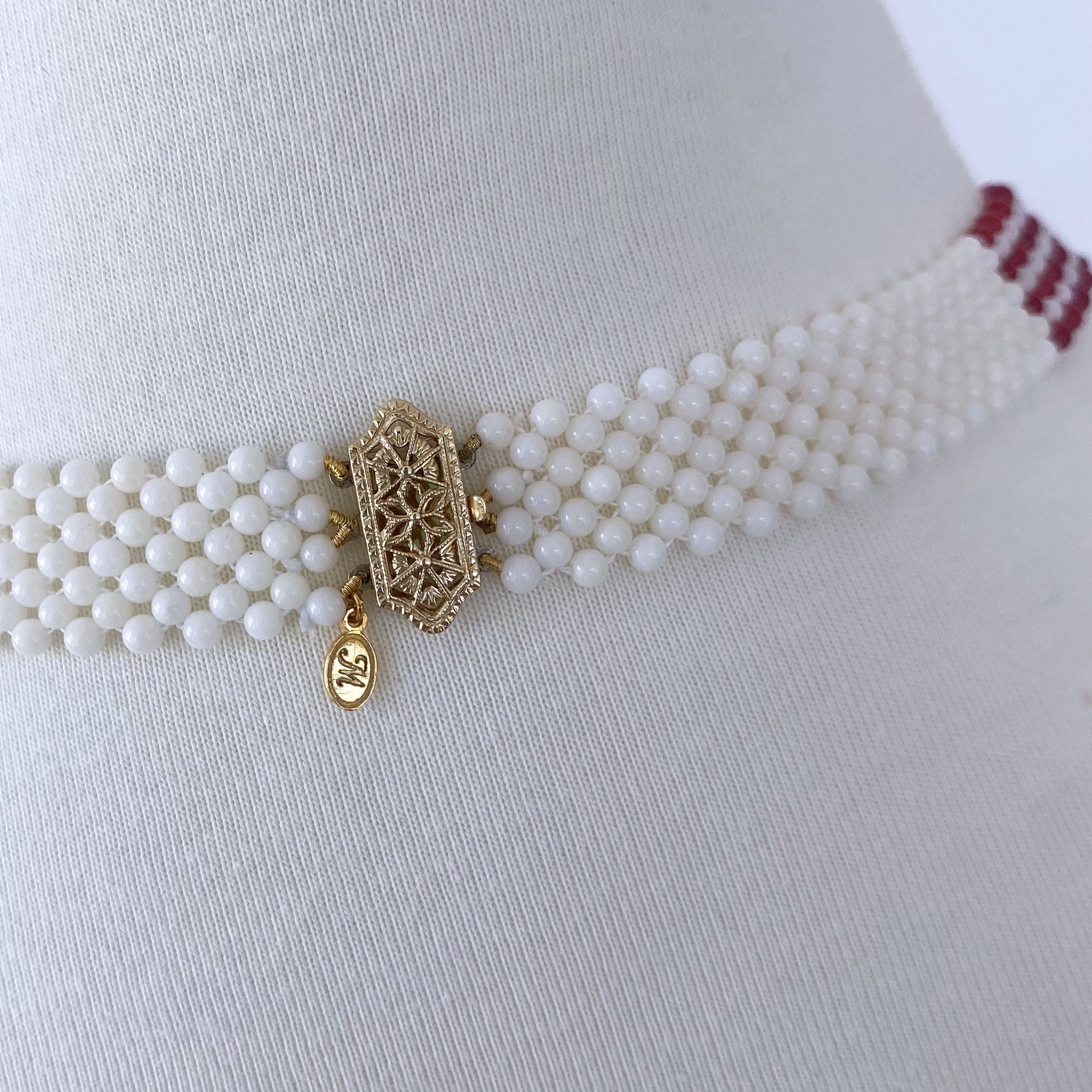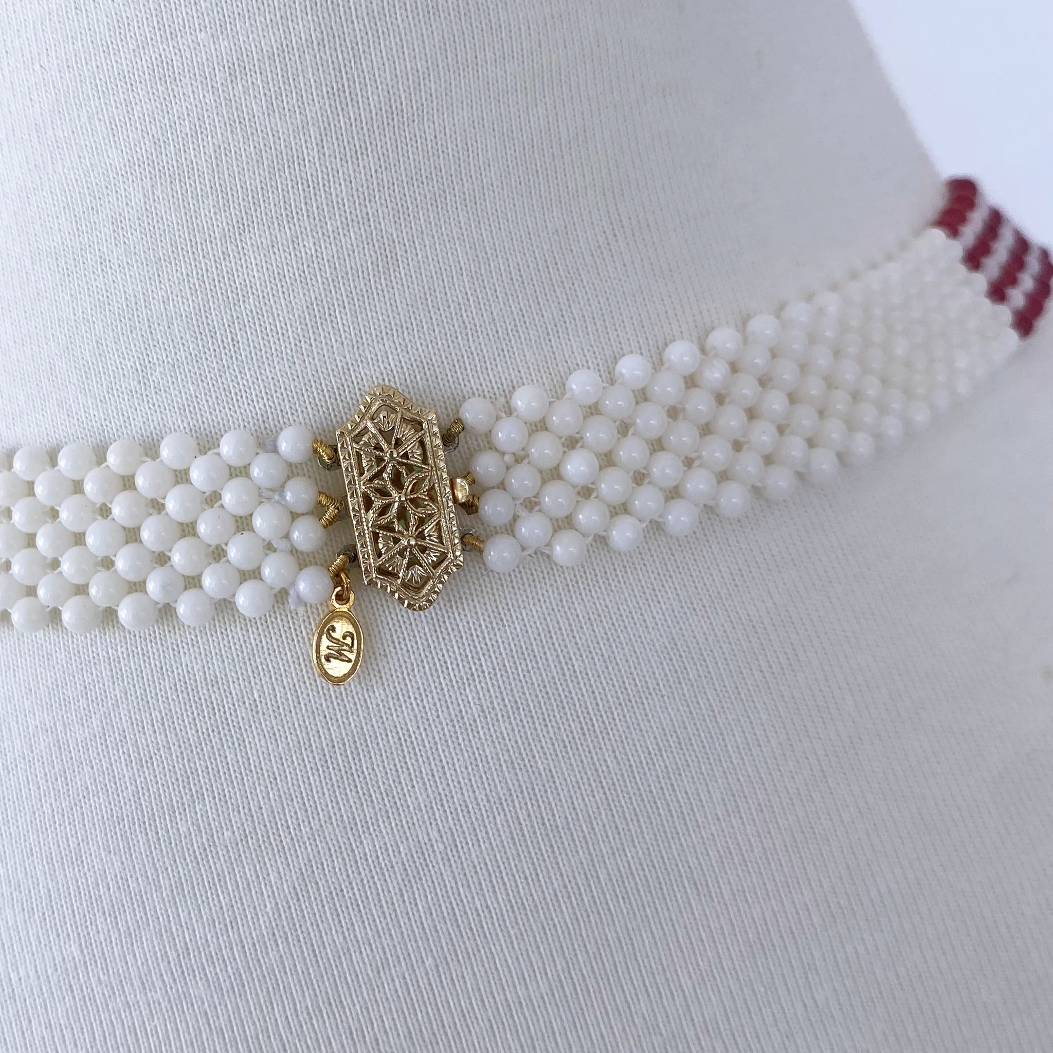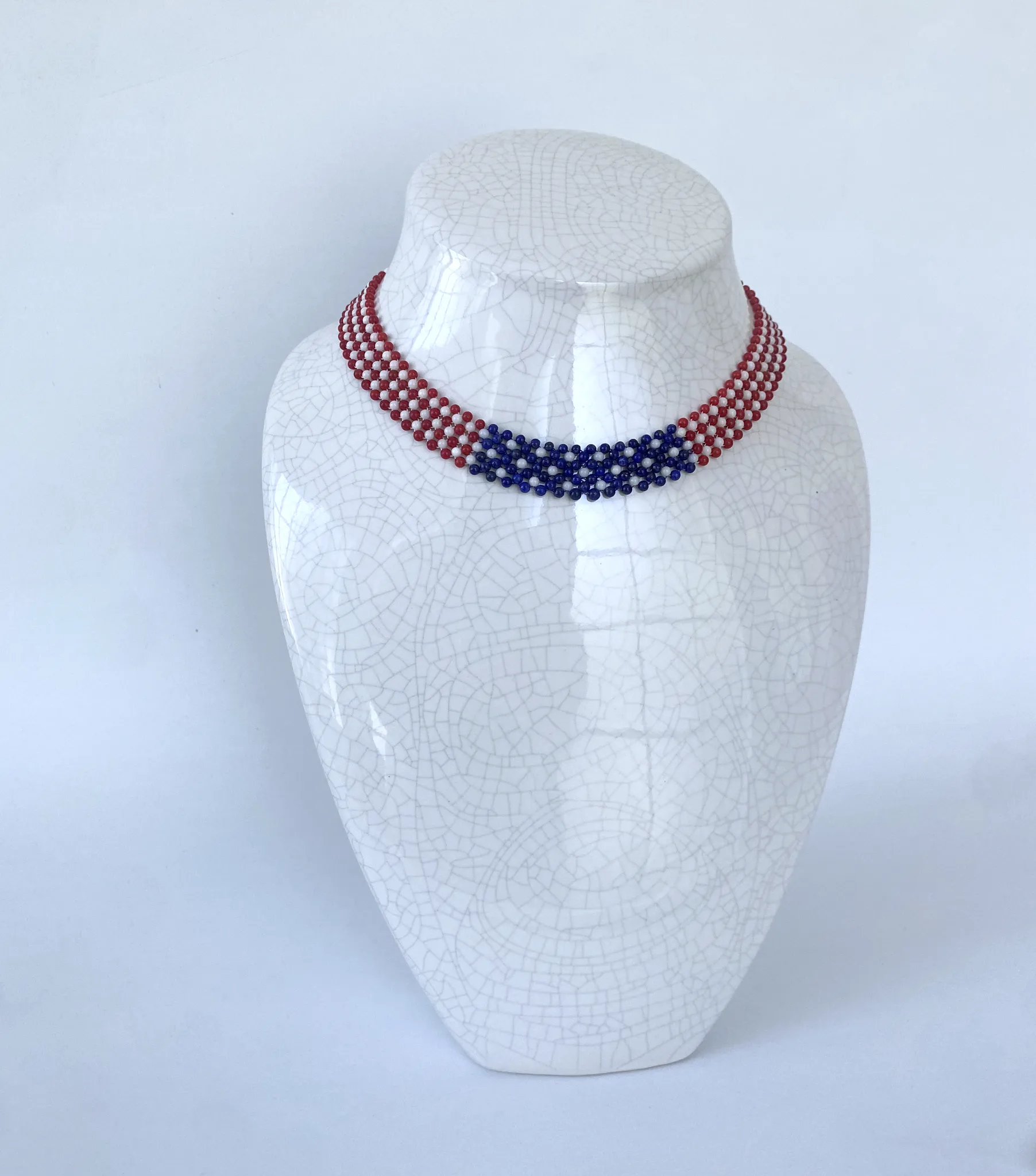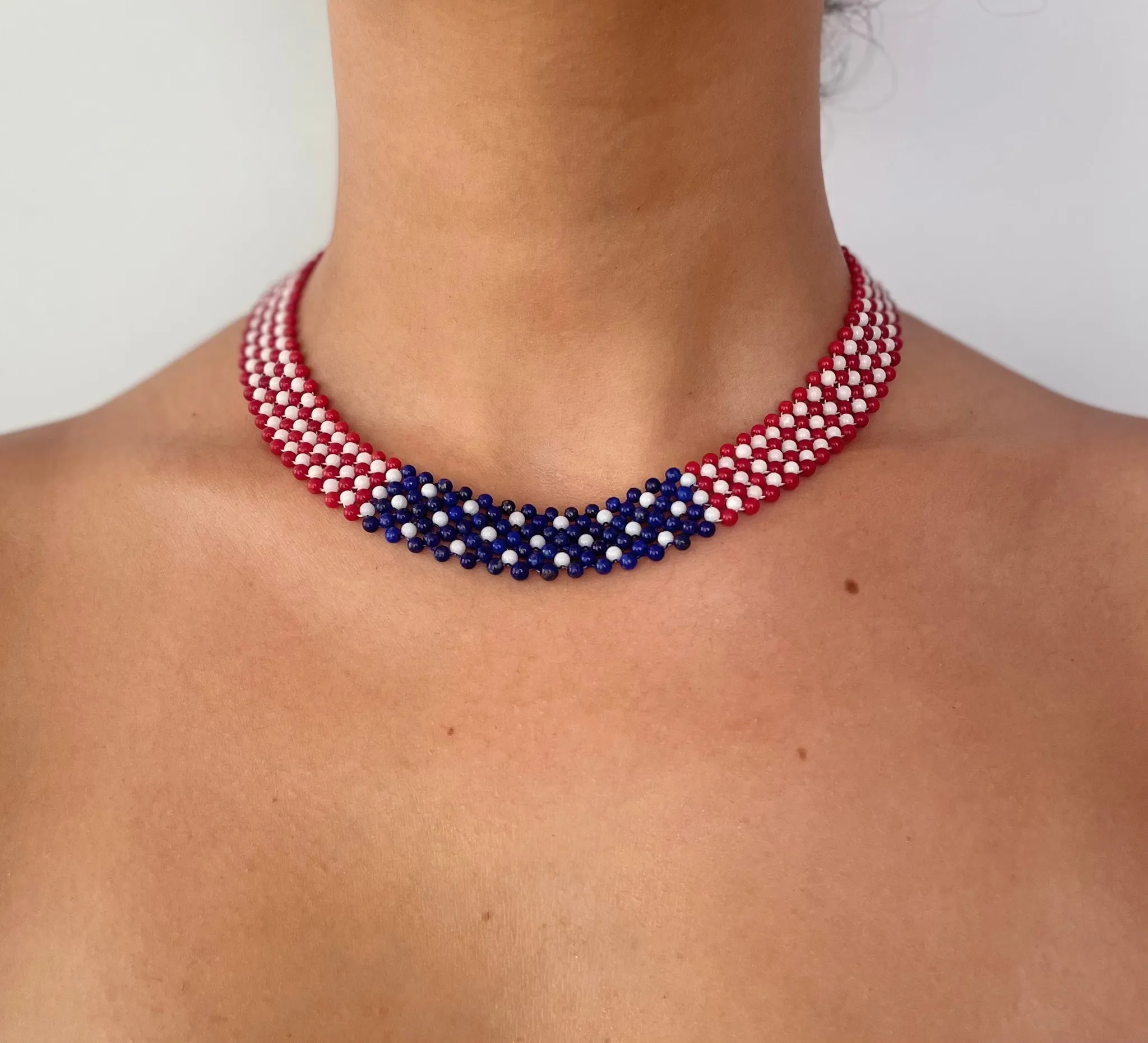 American Flag Woven Necklace by Marina J. This piece is made with all White & Red Coral and Lapis Lazuli all intricately woven together into a lace like design creating a stunning American Flag. Perfect piece for any patriot or showing off your love for the country. This Necklace measures 16 inches long and meets at a solid 14k Yellow Gold Decorative Filigree Clasp (marked 14k).